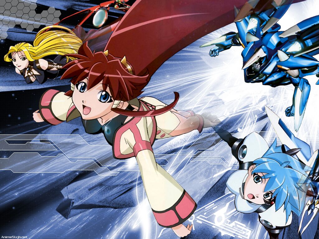 Description: A group of anime characters in a futuristic setting with a blue background and a red banner above them that says.