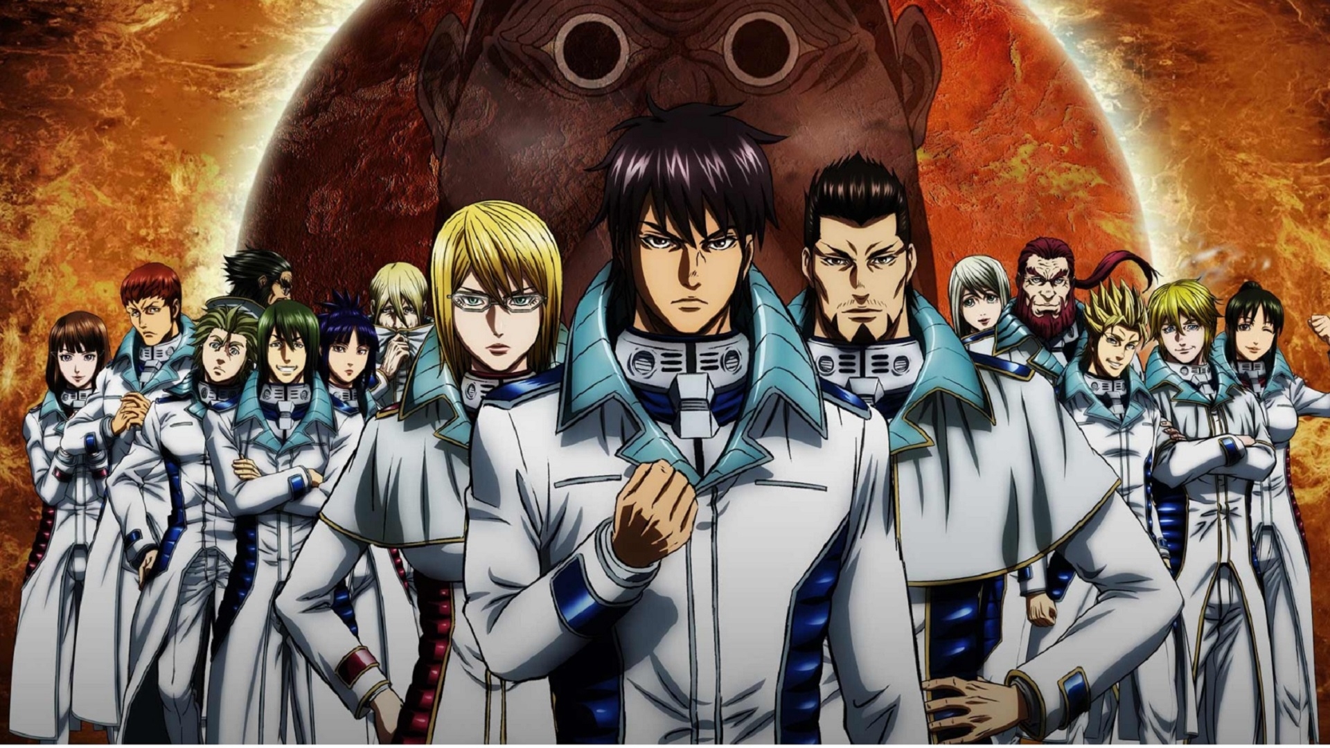 Description: A group of anime characters standing in front of a giant object with a giant head in the background and a giant black object in the middle.