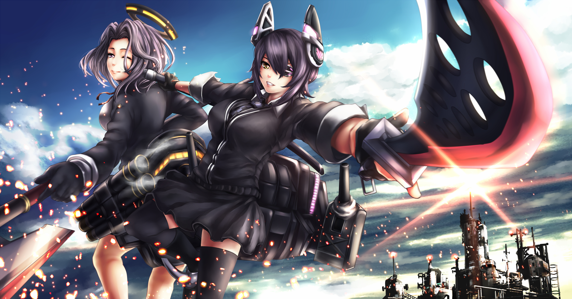 Description: Two anime characters are holding onto a giant object in the sky with a city in the background and a blue sky with clouds.