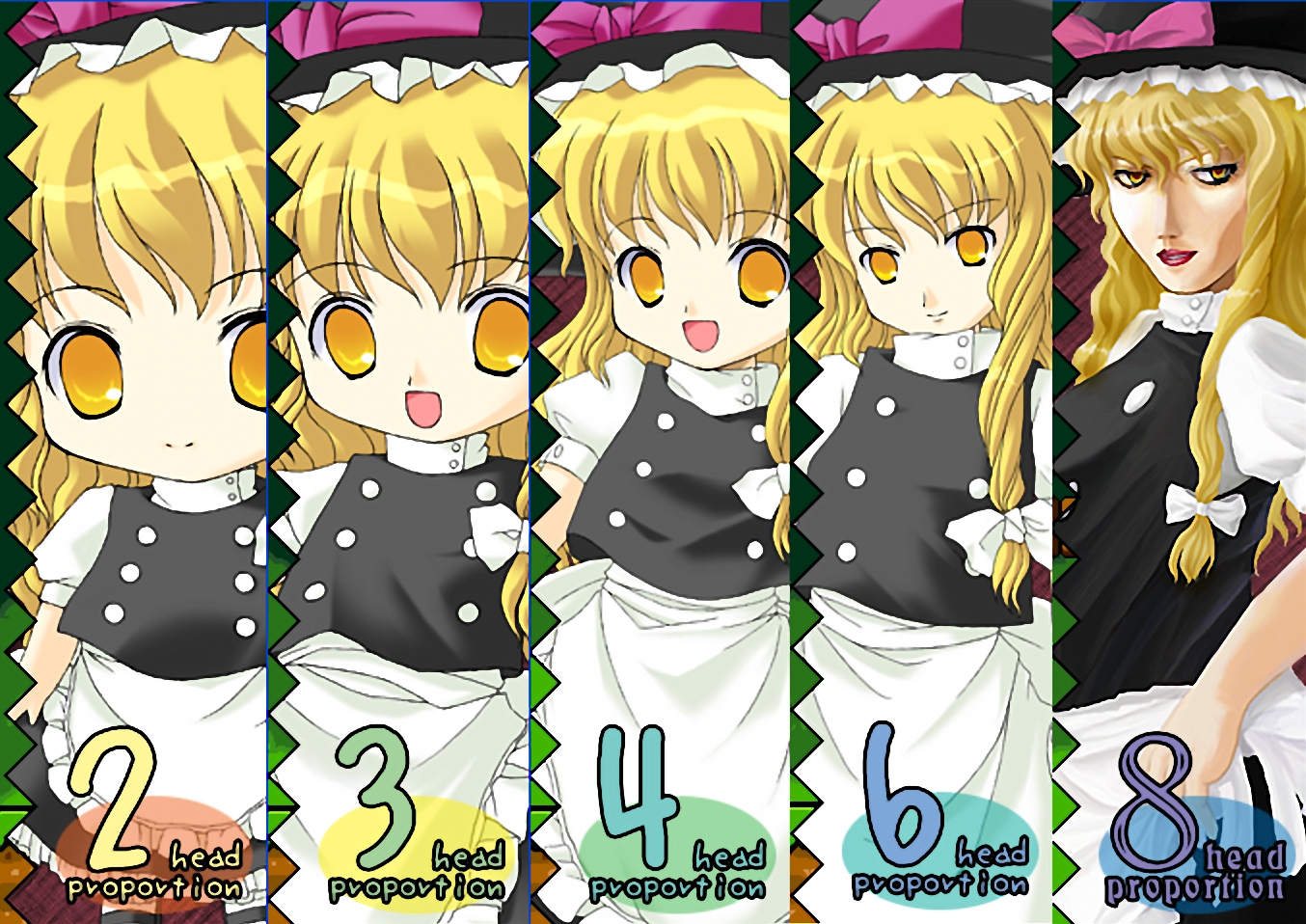 Description: A series of anime character pictures with numbers in them and a girl in a dress with a bow on her head.