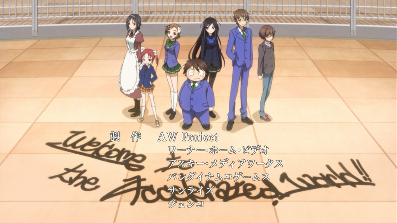 Description: A group of anime characters standing in a room with graffiti on the floor and a sign that says.