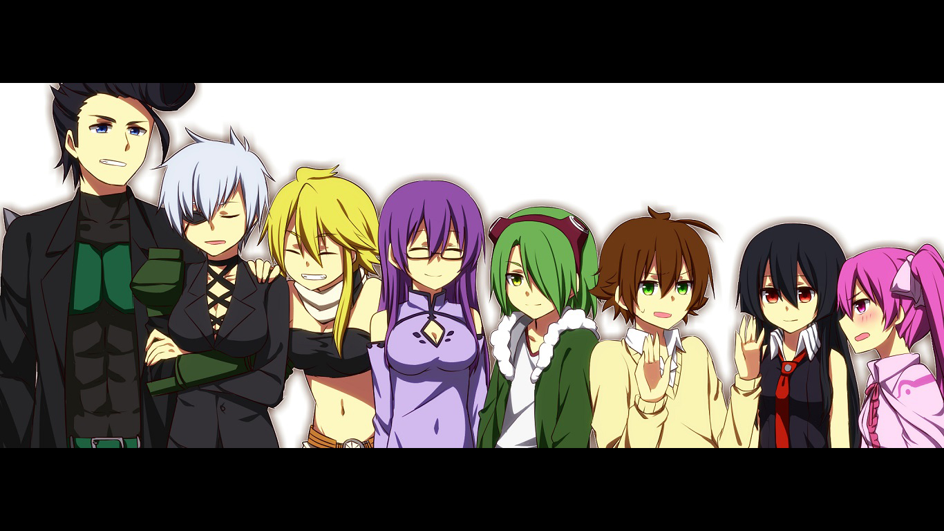 Description: A group of anime characters standing next to each other in a row with their arms crossed and their backs turned.