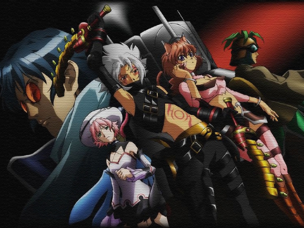 Description: A group of anime characters standing next to each other in front of a black background with a red light.