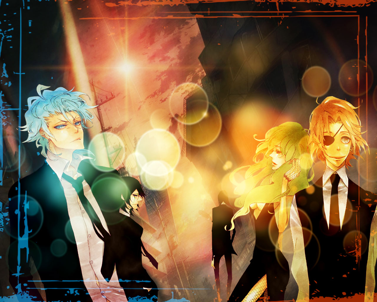 Description: A group of anime characters standing next to each other in front of a bright background with a blue and yellow light.