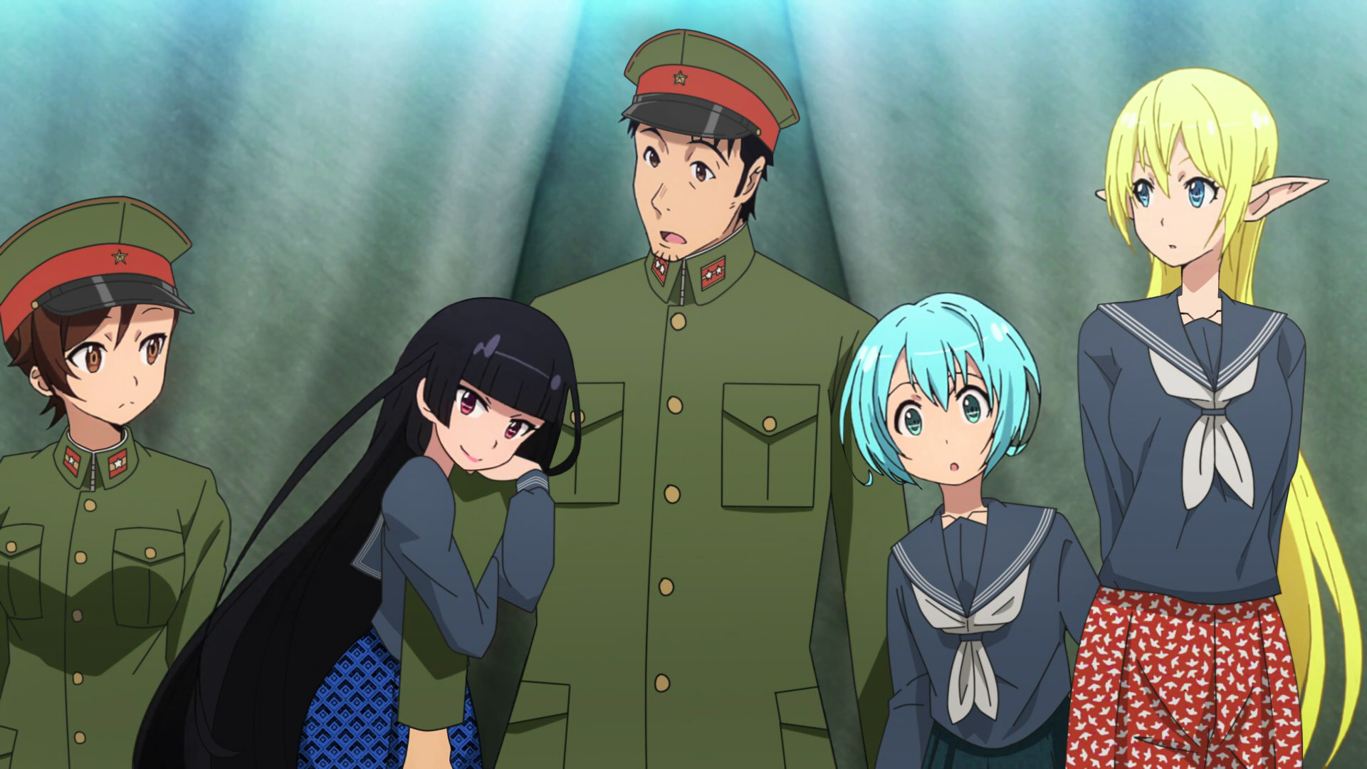 Description: A group of anime characters standing next to each other in front of a light fixture with a green background.