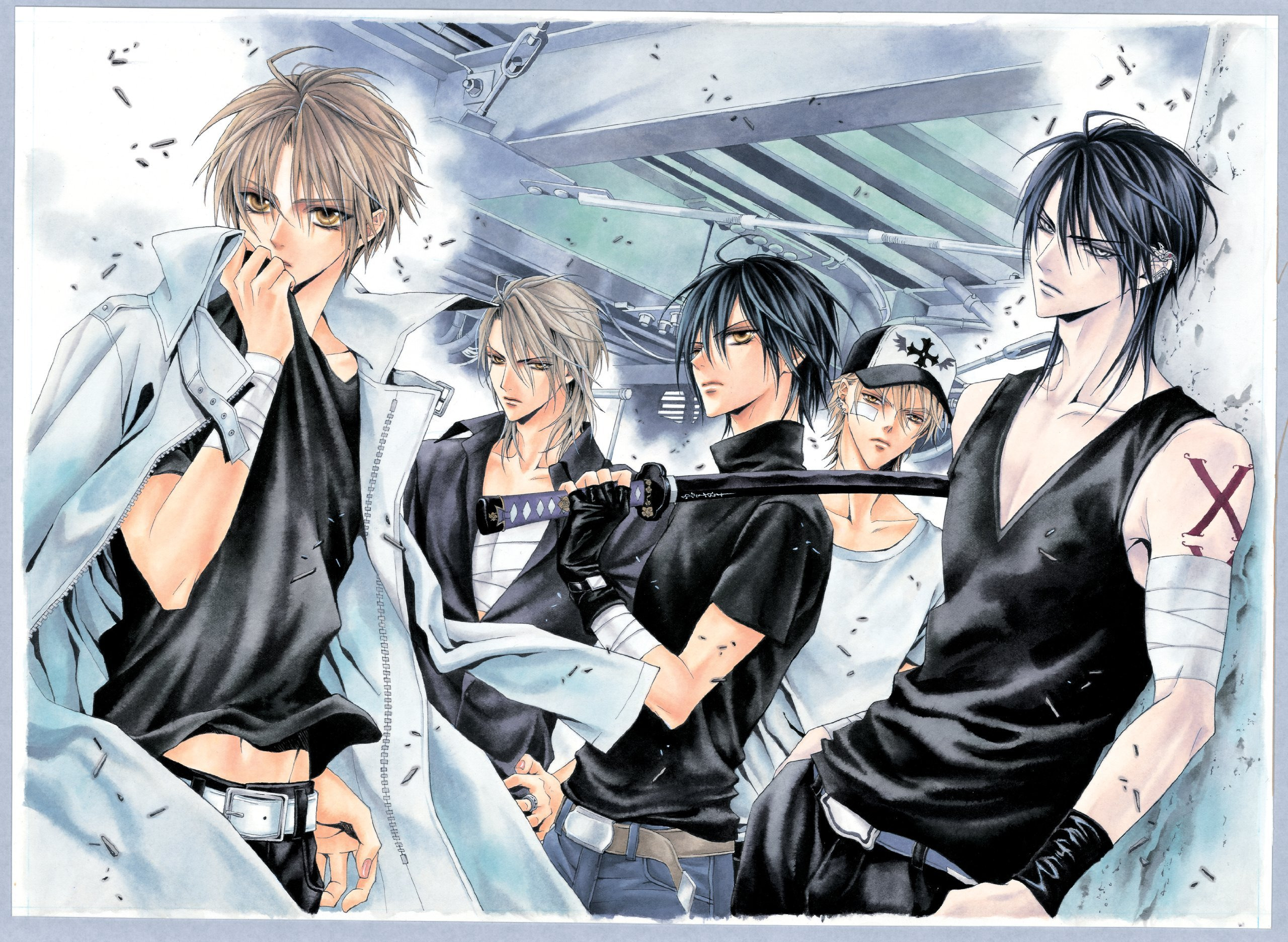 Description: A group of anime characters standing next to each other in a room with a wallpaper behind them and a drawing of them.