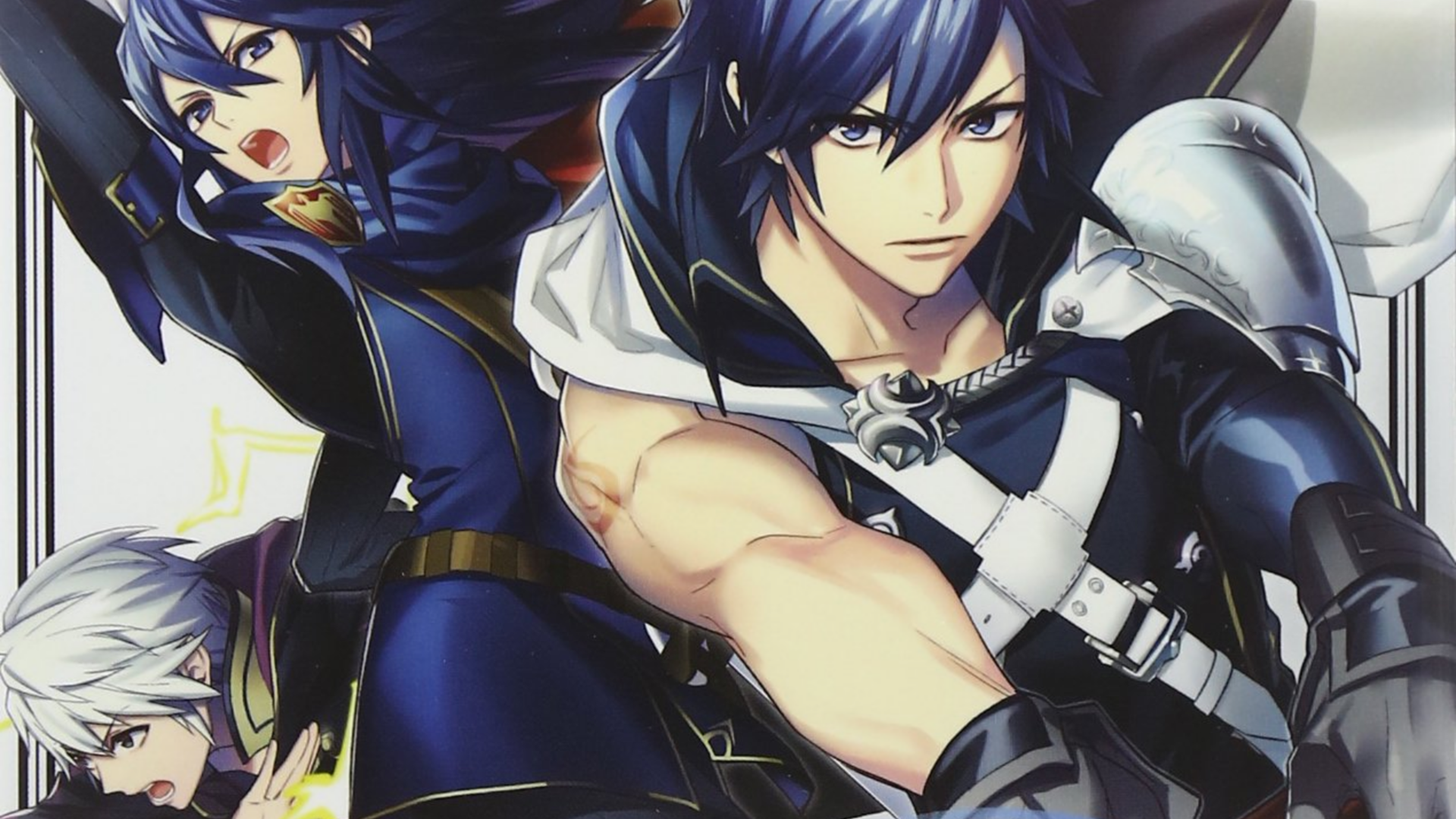 Description: A group of anime characters standing next to each other in front of a white wall with a black frame.