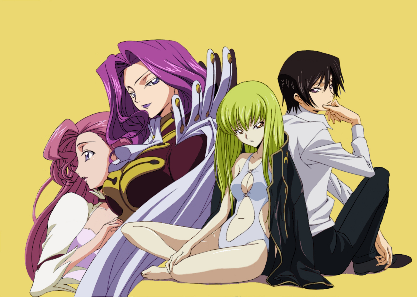 Description: A group of anime characters sitting next to each other on a yellow background with a yellow background behind them.