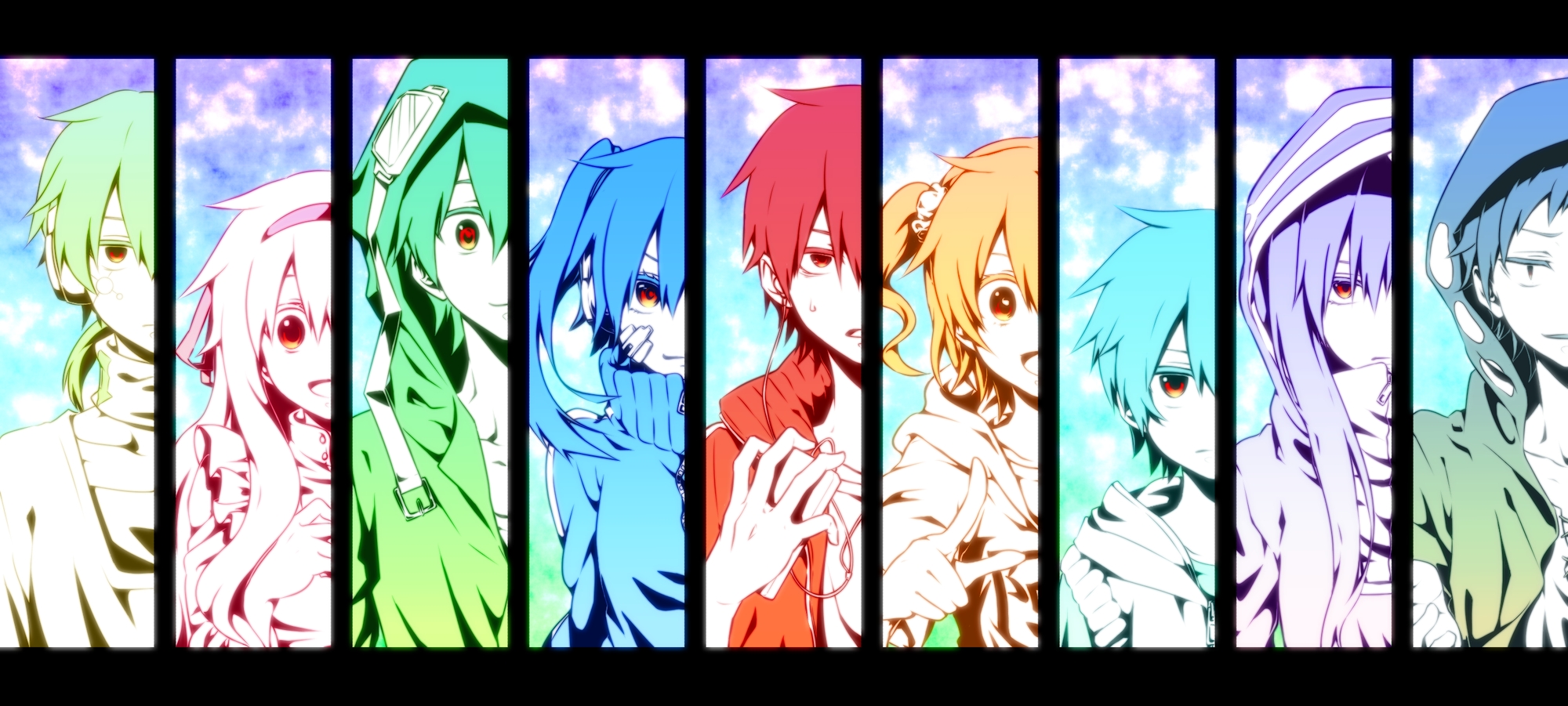 Description: A row of anime characters with different colored hair colors and hair styles.