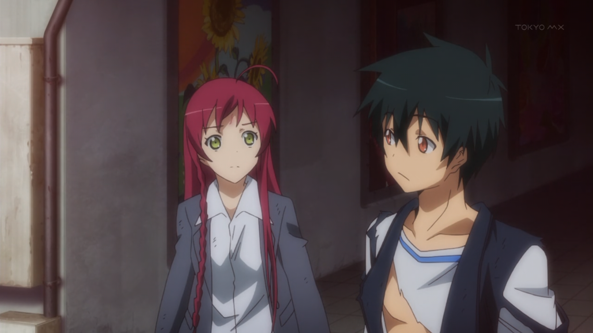 Description: Two anime characters standing next to each other in a hallway with a flower pot in the background and a door.