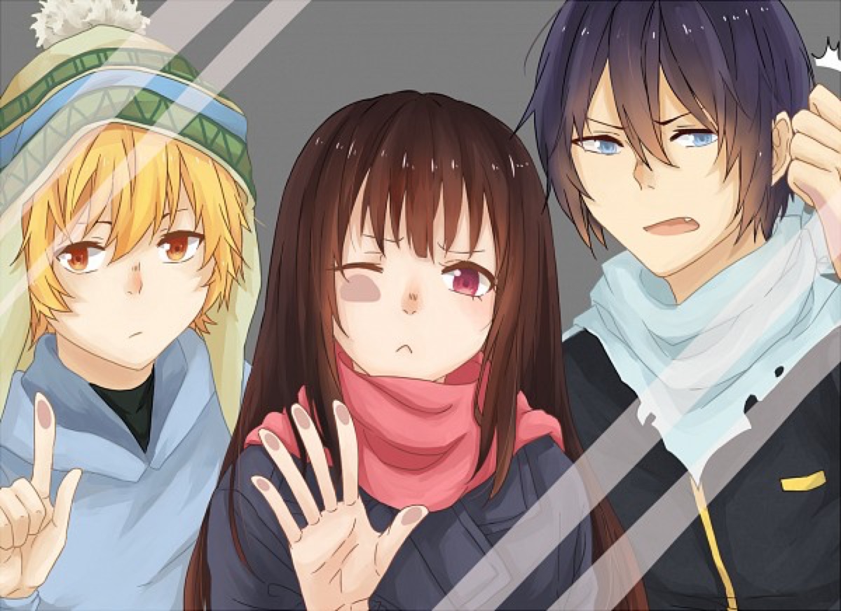 Description: Three anime characters are standing together and one is holding his hand up to the side of his head and the other is holding his hand up.