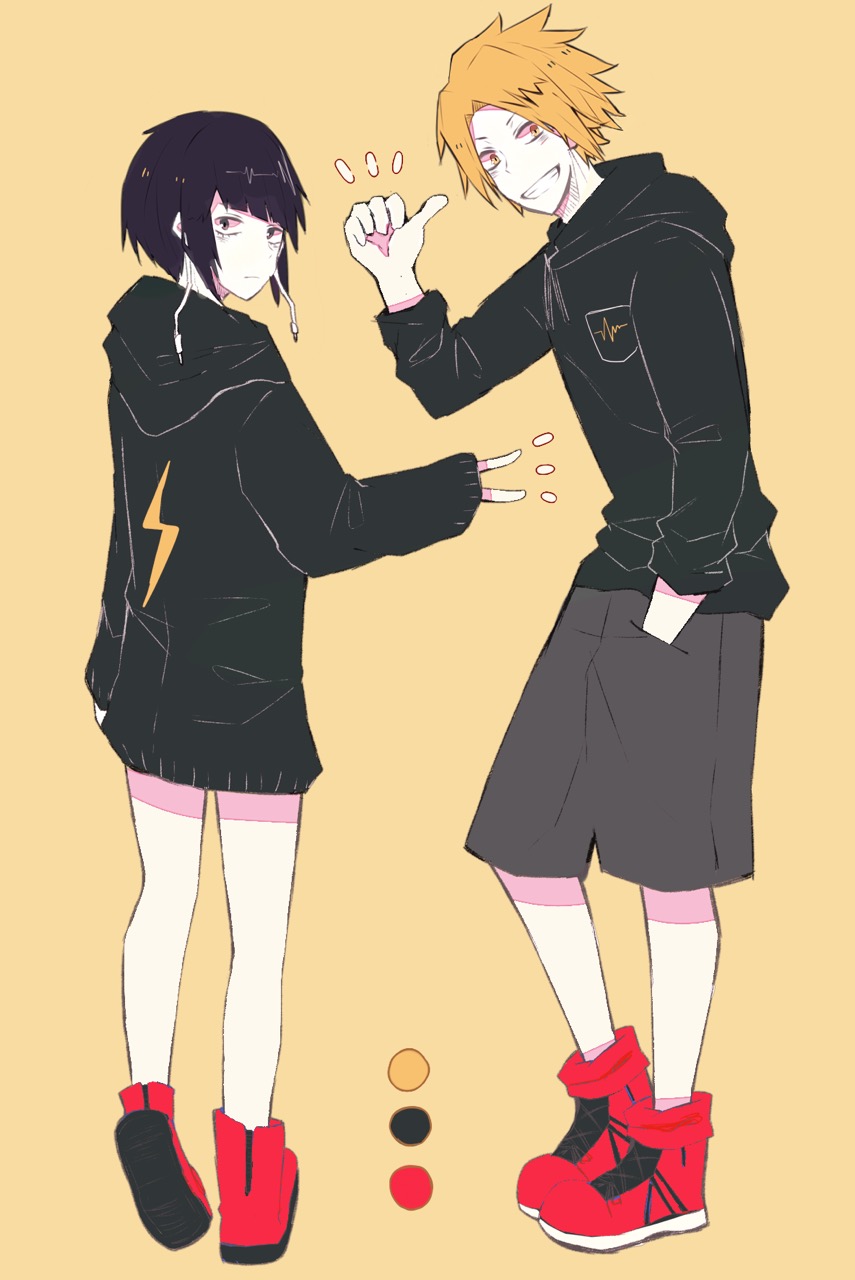 Description: Two anime characters standing next to each other with their hands together and one has his hand on the other.
