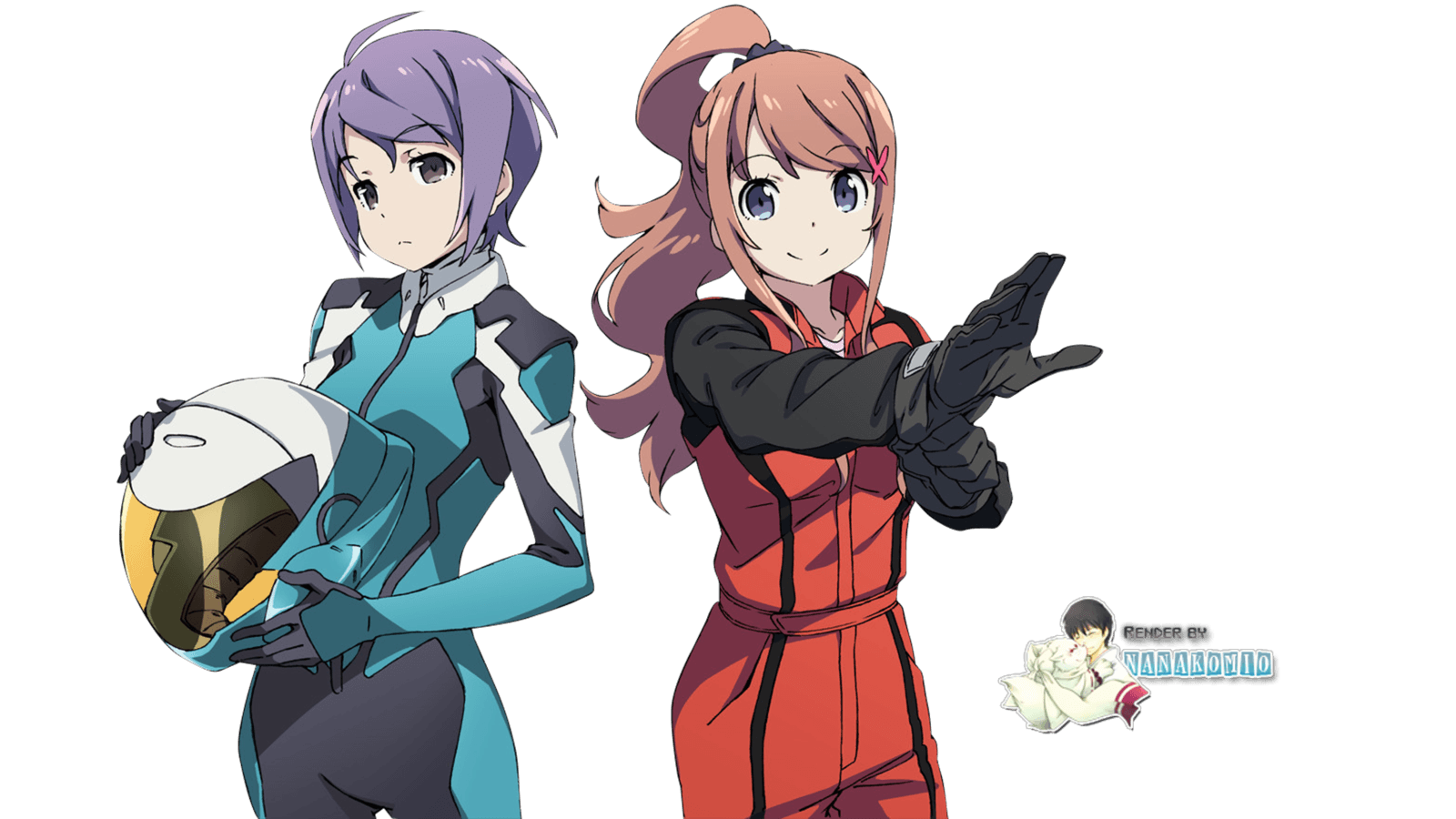 Description: Two anime characters are standing next to each other with their hands together and pointing at something in the air.