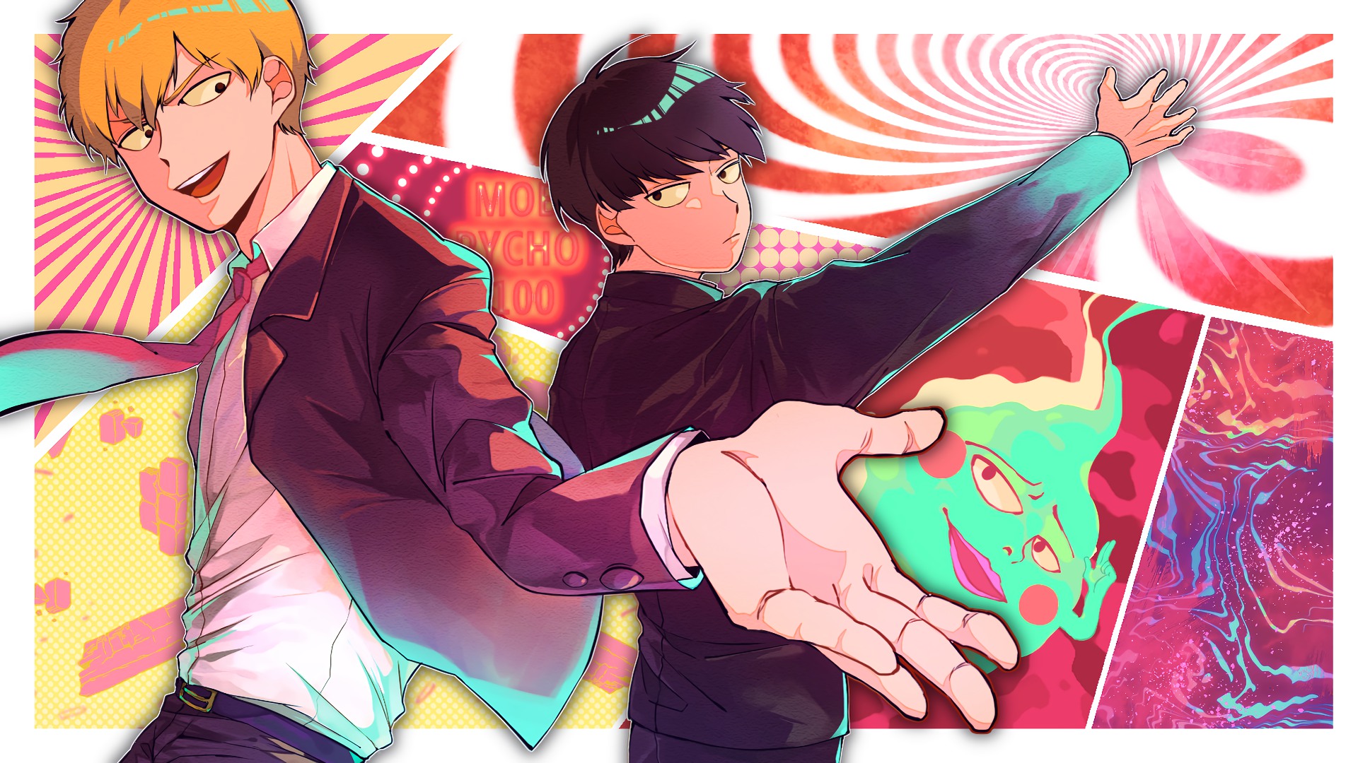 Description: Two anime characters are shaking hands in front of a colorful background with a swirly design on it and a starburst.