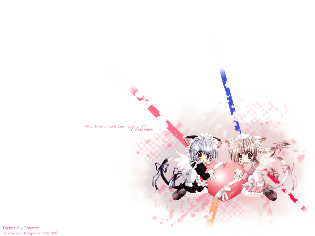 Description: Two anime characters holding a heart and two swords with a pink background with a red heart and a blue and white arrow.