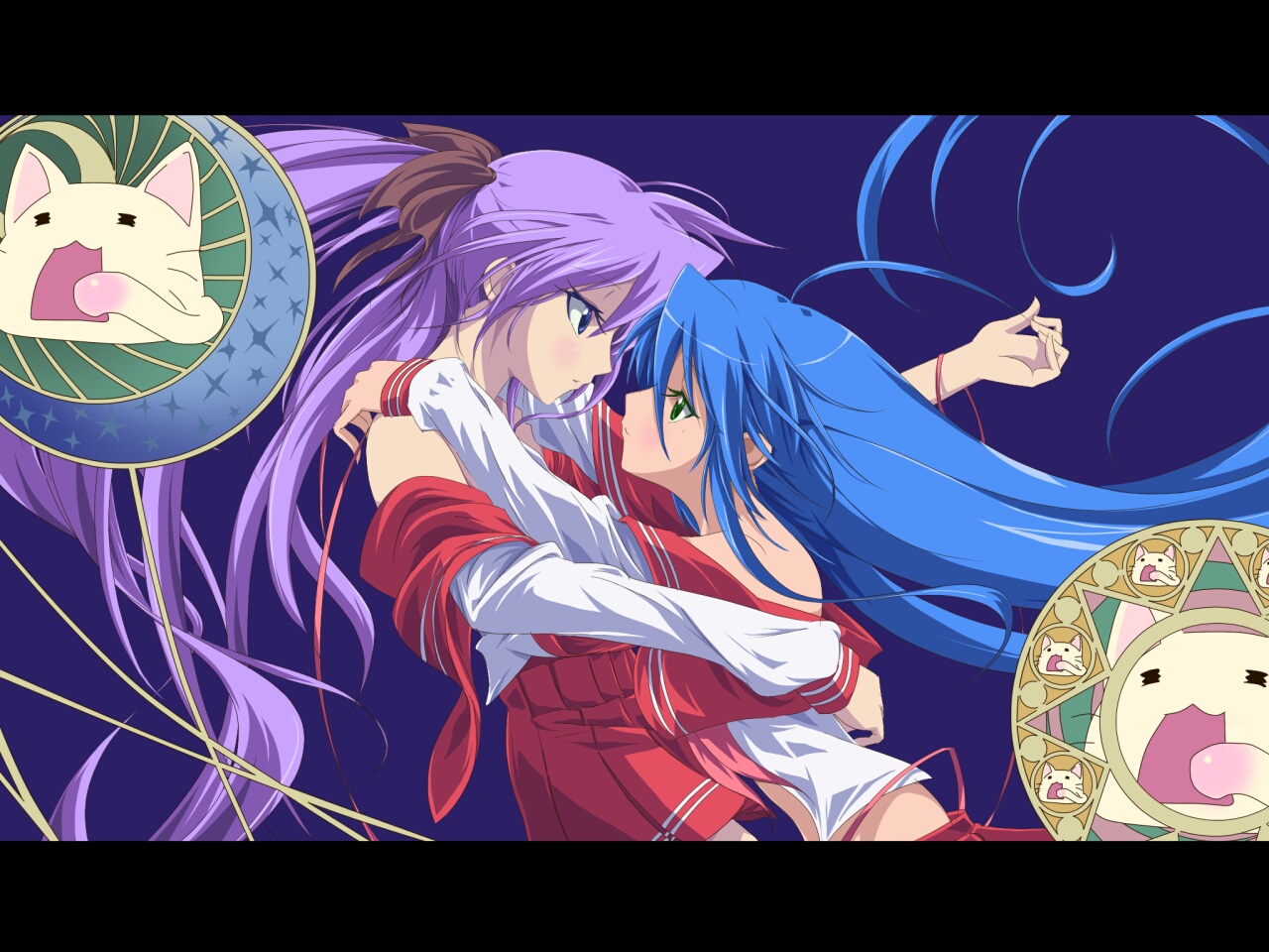 Description: Two anime characters hugging each other with a cat in the background and a cat on the wall behind them.