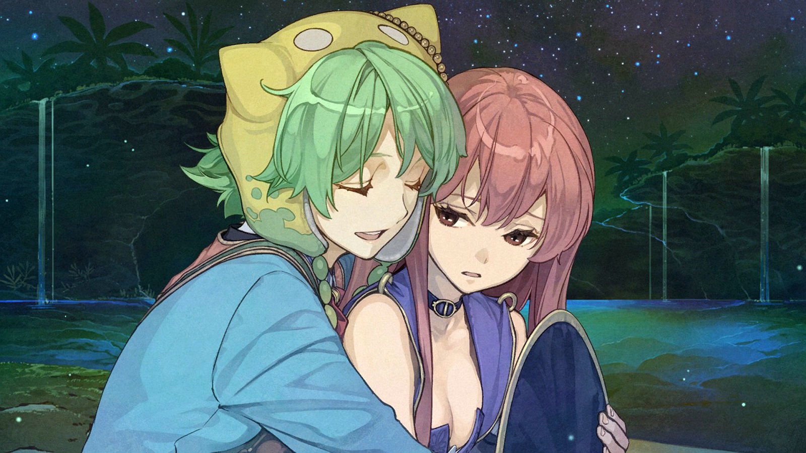 Description: Two anime characters are hugging in front of a night sky with stars and palm trees in the background.
