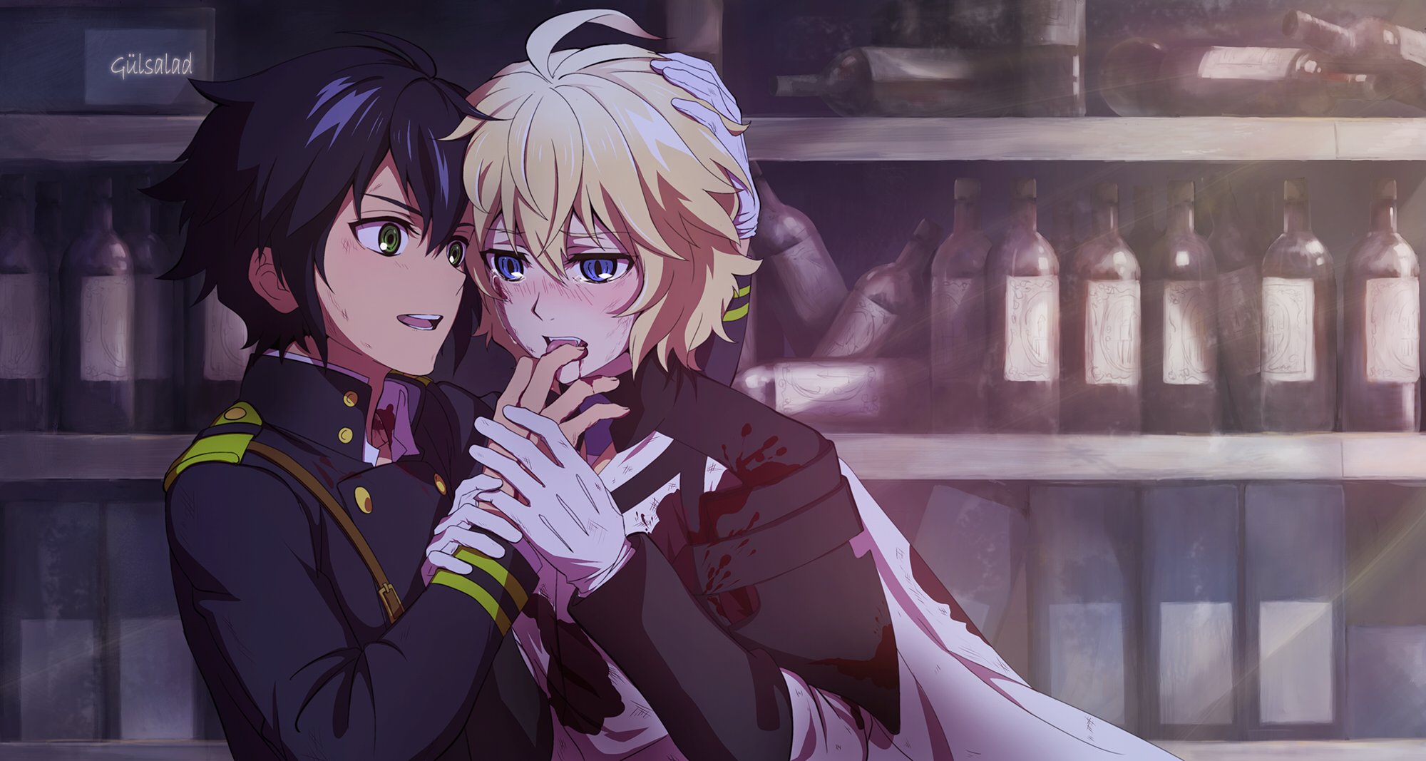 Description: Two anime characters are hugging in front of a shelf of bottles and bottles of wine in a library of books.