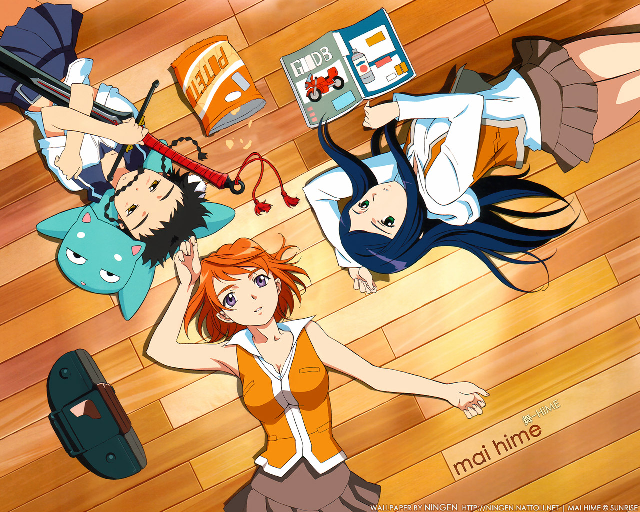 Description: A group of anime characters laying on a wooden floor together with a laptop and a phone in the background.