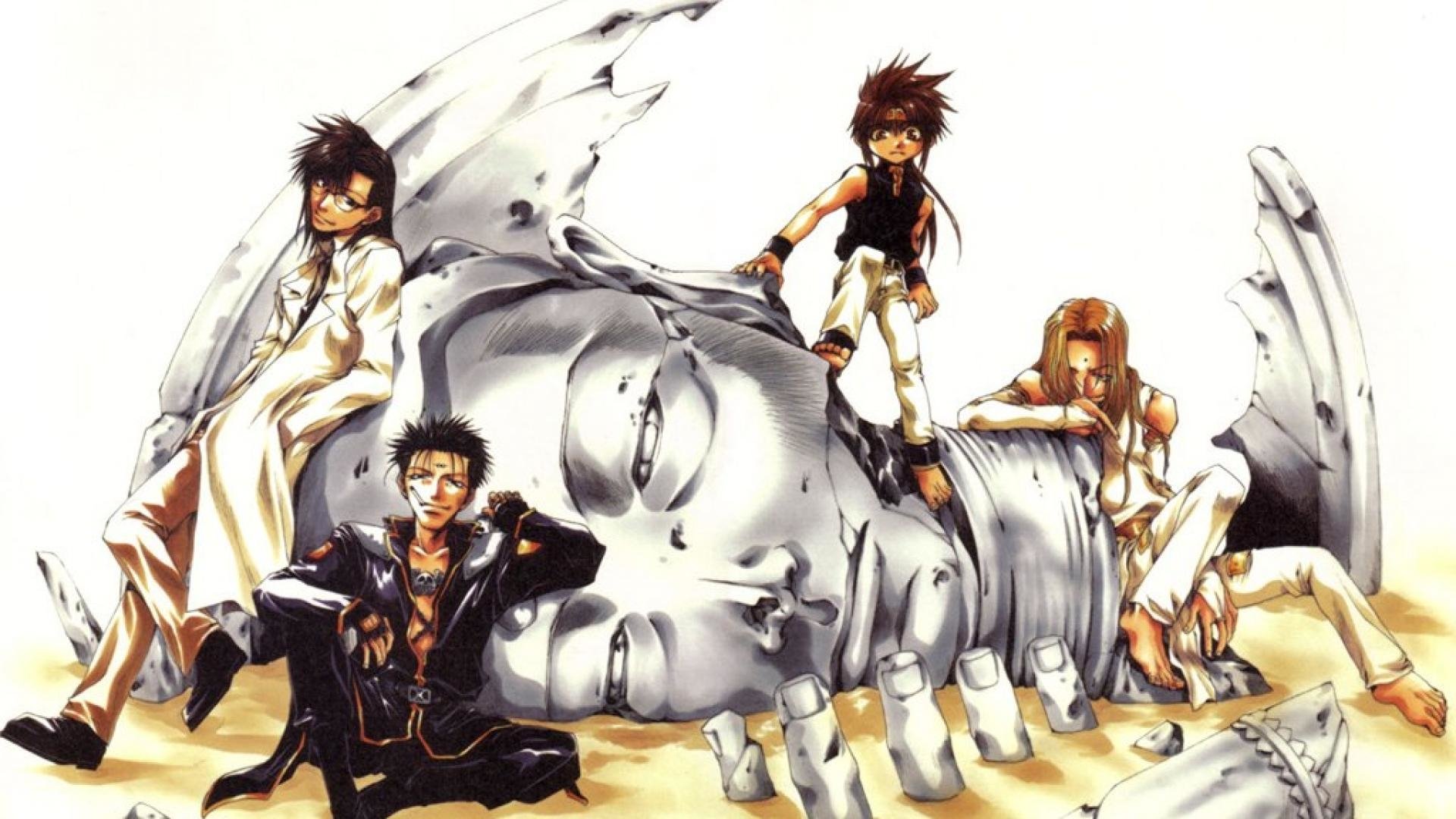 Description: A group of anime characters sitting on top of a giant metal object in the sand with their feet on the ground.