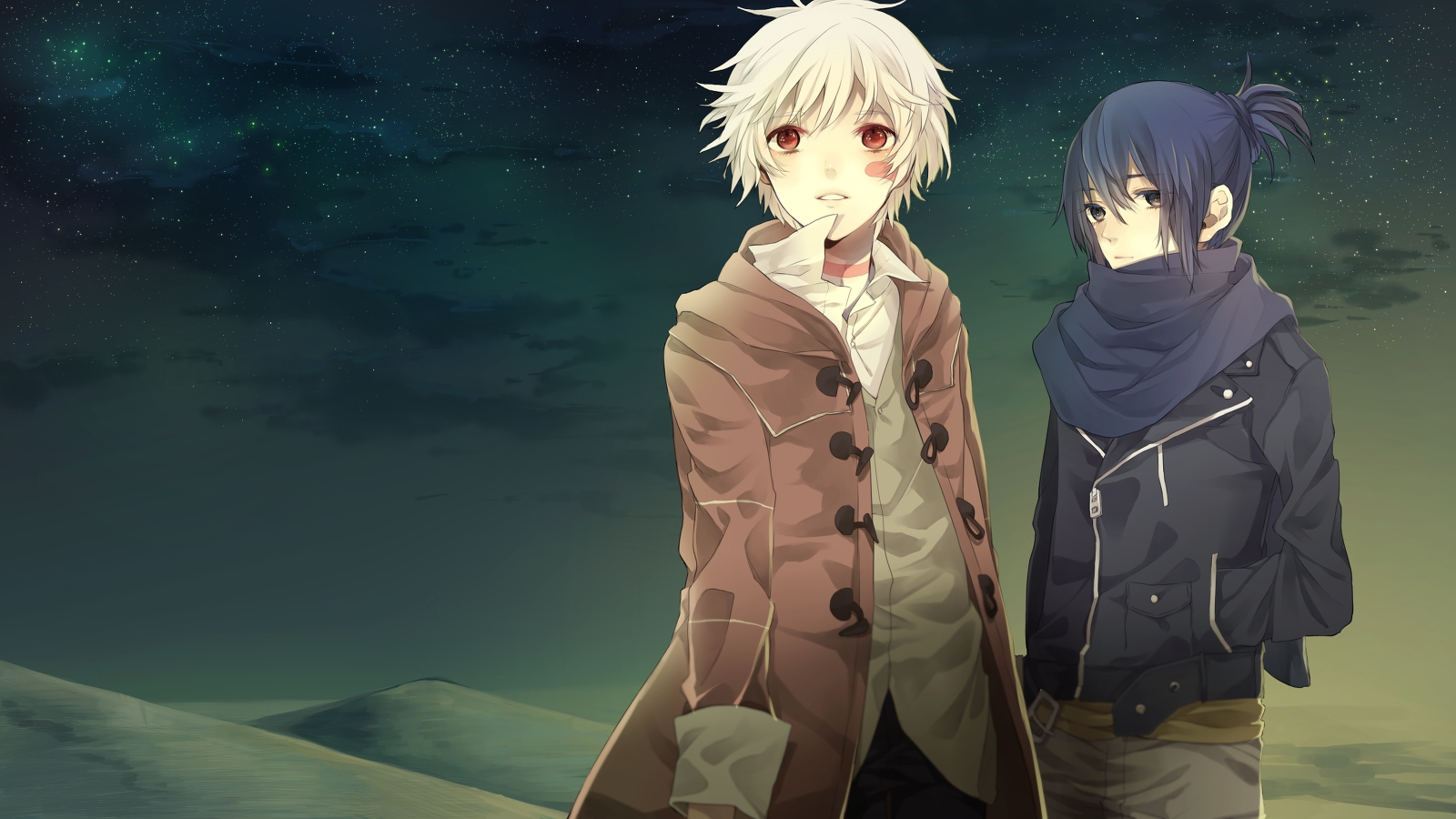 Description: Two anime characters standing next to each other in the night sky with stars in the background and a mountain in the background.