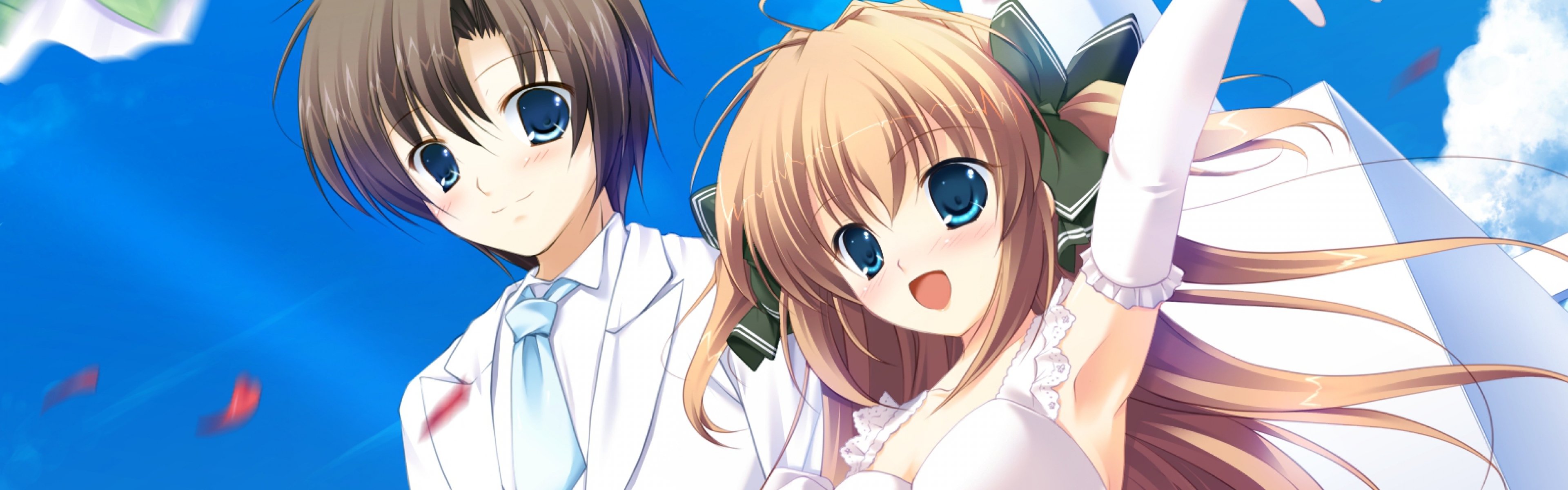 Description: Two anime characters are posing for a picture together in front of a blue sky with clouds and stars in the background.