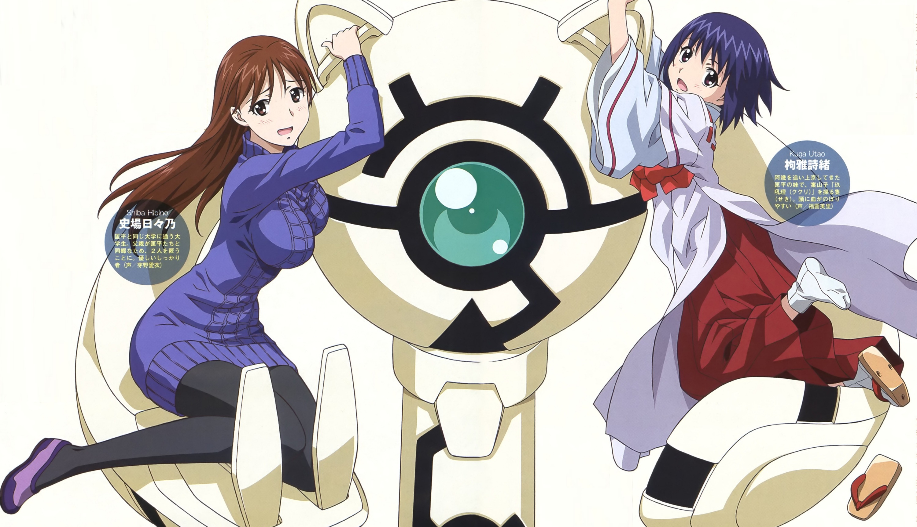 Description: Two anime characters are posing for a picture together with a clock in the background and a woman in a purple dress.