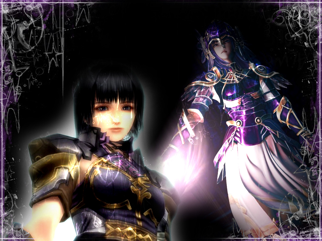 Description: Two anime characters in a purple frame with a black background and a purple border with a white border and a purple border with a black border with a purple border.
