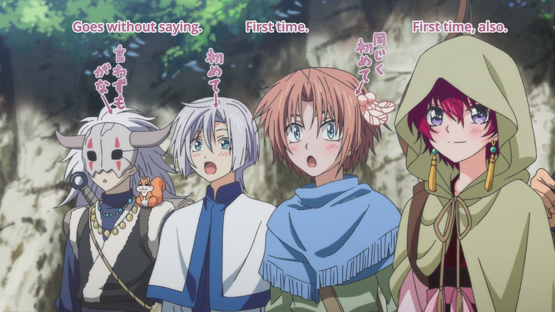 Description: A group of anime characters standing next to each other in front of a rock wall with the words.