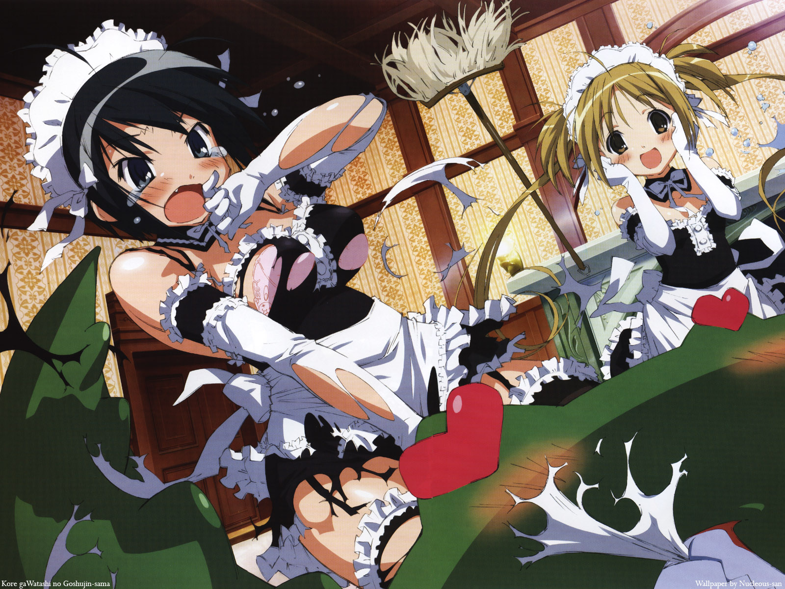 Description: Two anime characters in a room with a green carpet and a window with a red heart on it and a green carpet.
