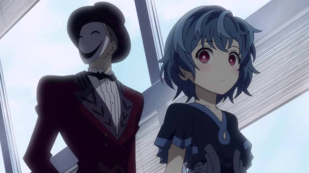 Description: Two anime characters standing next to each other in a room with windows and blinds on the ceiling.