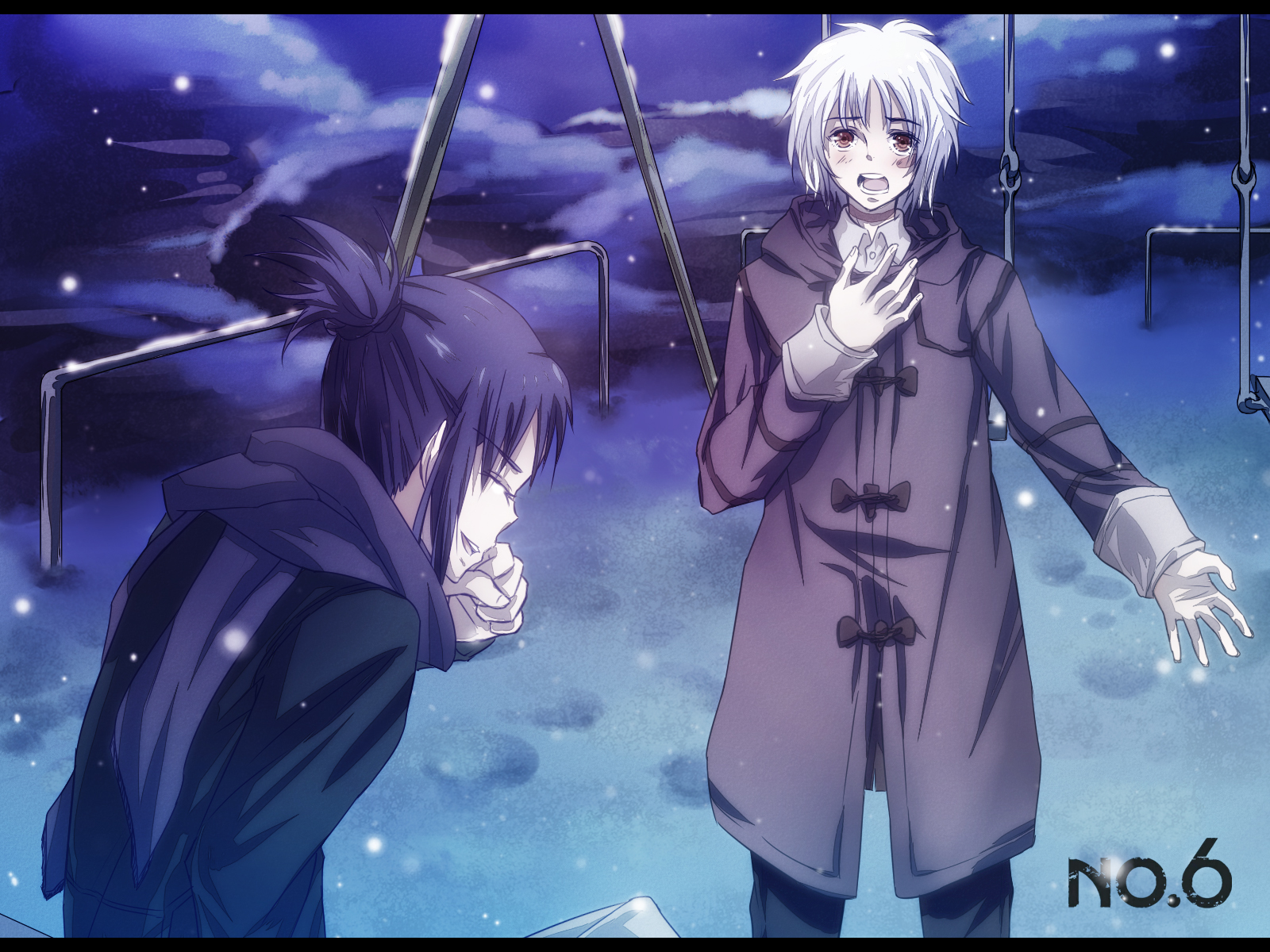 Description: Two anime characters standing in front of a sky background with clouds and stars in the background.