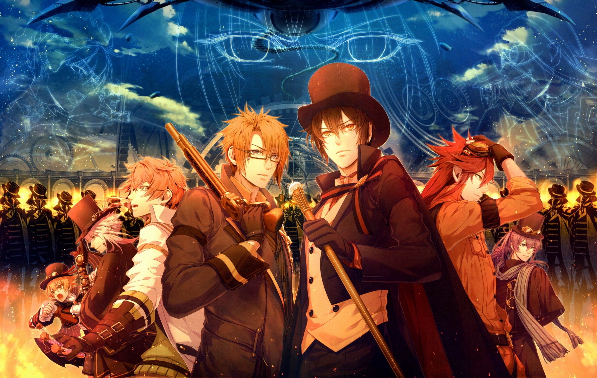 Description: A group of anime characters standing in front of a sky background with clouds and a giant clock above them.