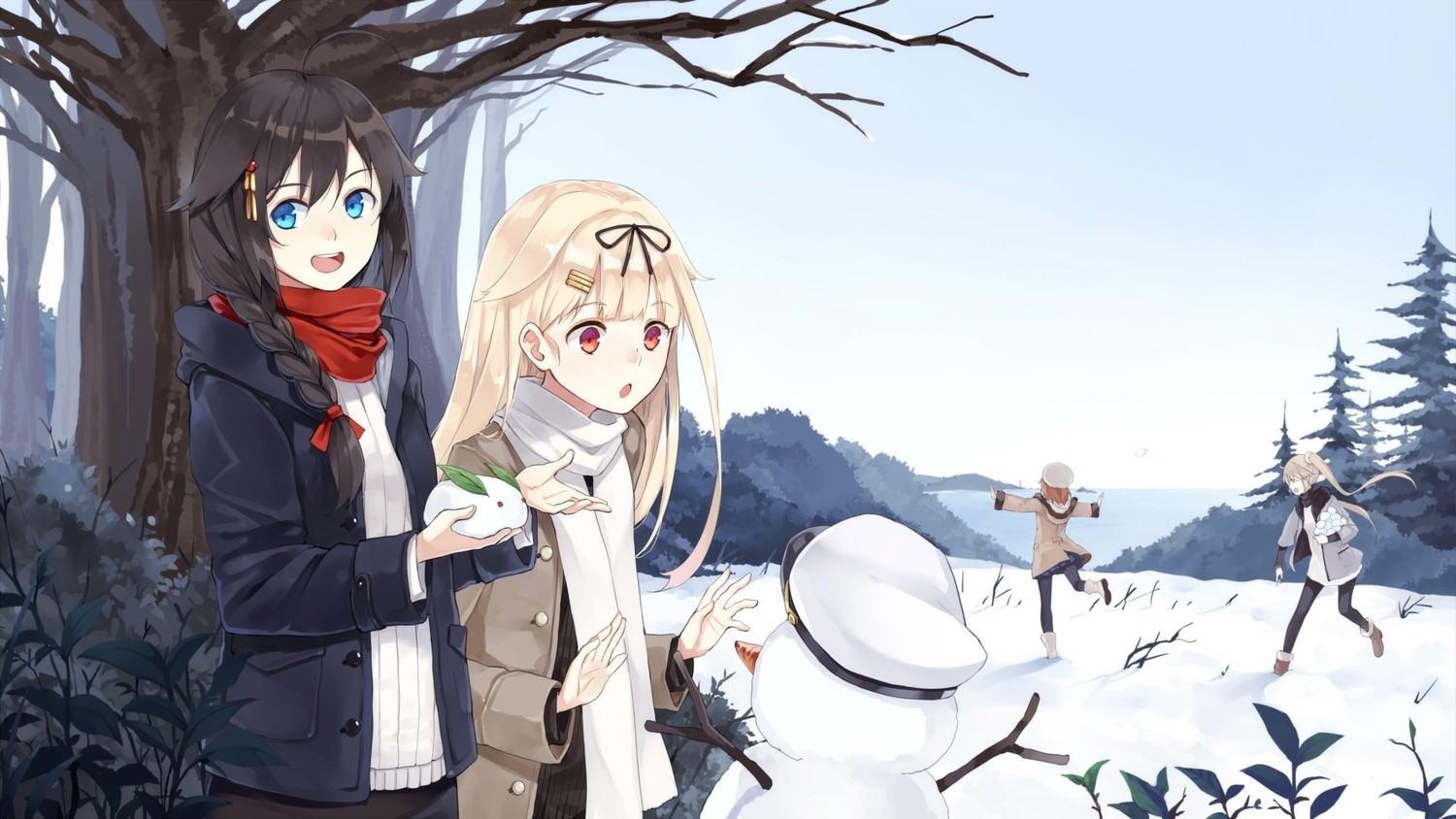 Description: Two anime characters standing in the snow in front of a tree and a snowman in the background with a snowman in the foreground.