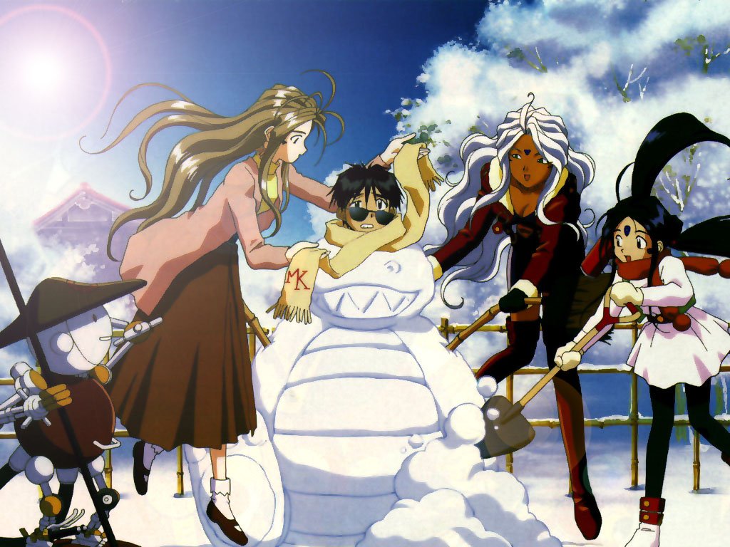 Description: A group of anime characters standing around a snowman in the snow with a woman in a dress and a man in a suit.