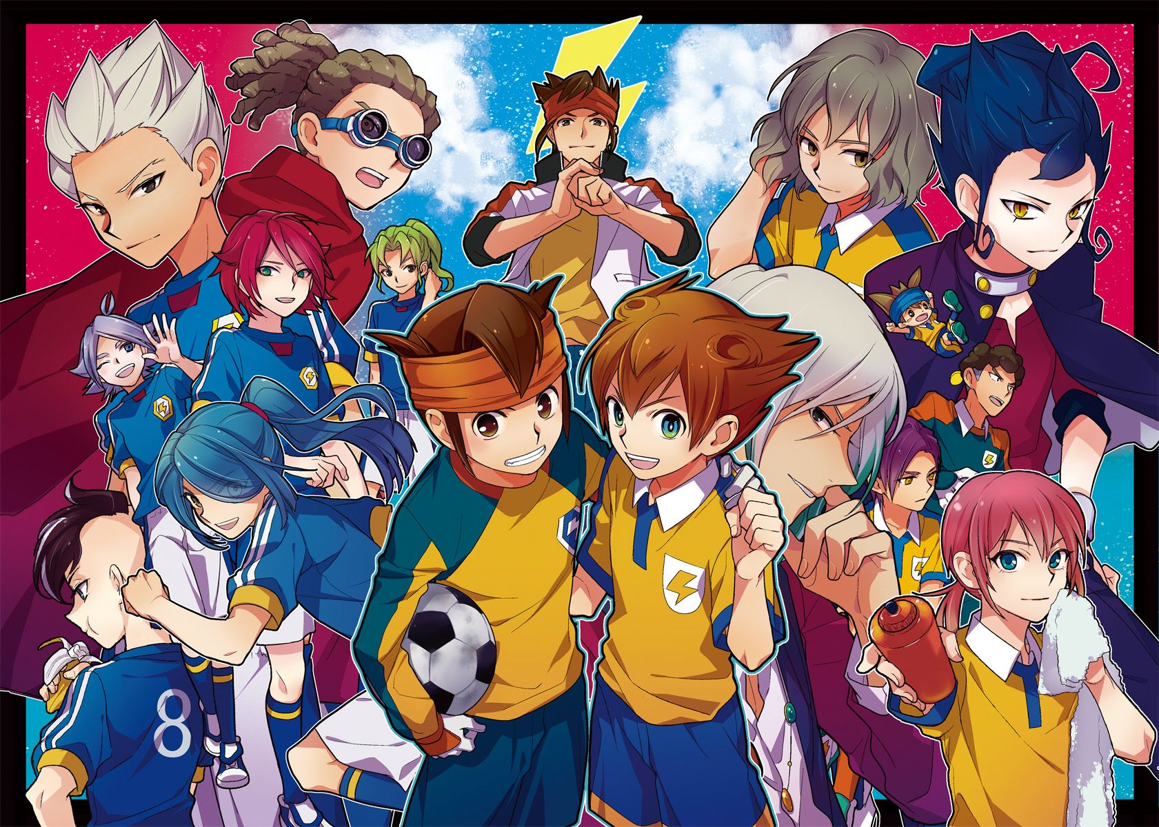 Description: A group of anime characters with a soccer ball in front of them and a sky background with clouds and stars.