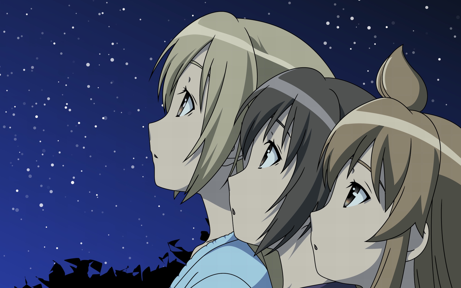 Description: Two anime characters staring at the stars in the sky with trees in the background and a night sky with stars.