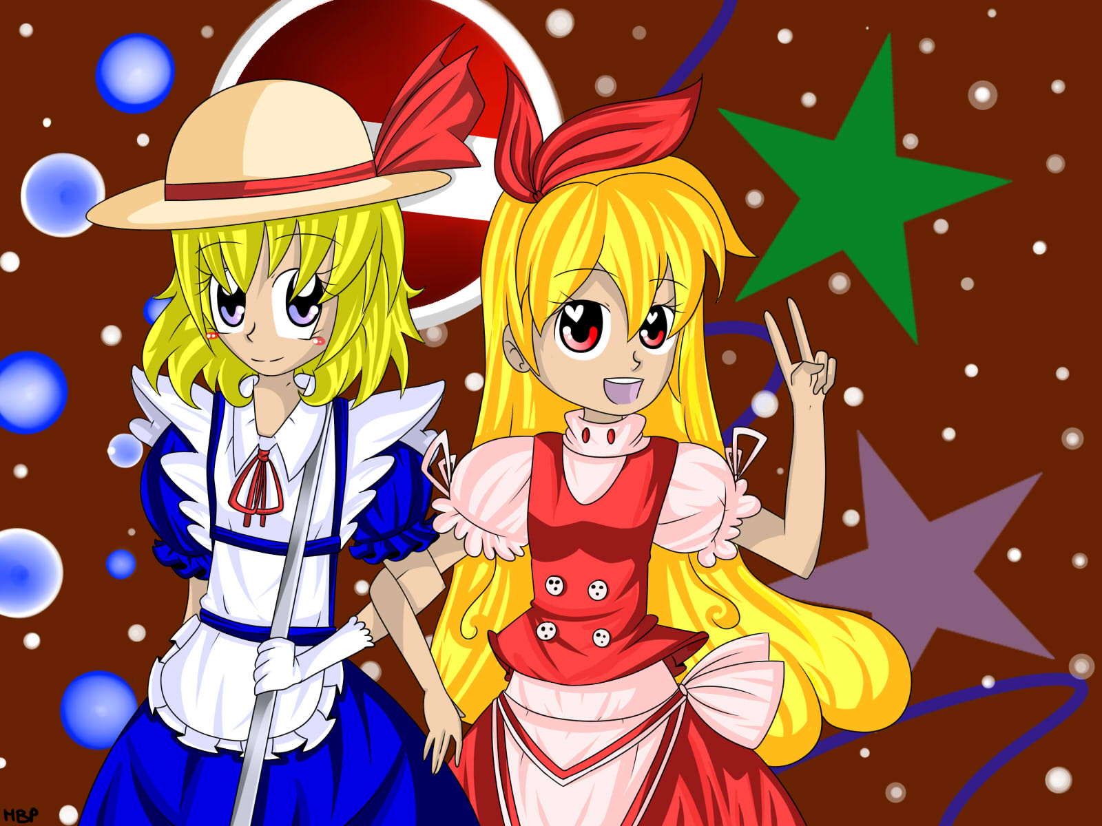 Description: Two anime characters standing next to each other in front of stars and snowflakes on a brown background.