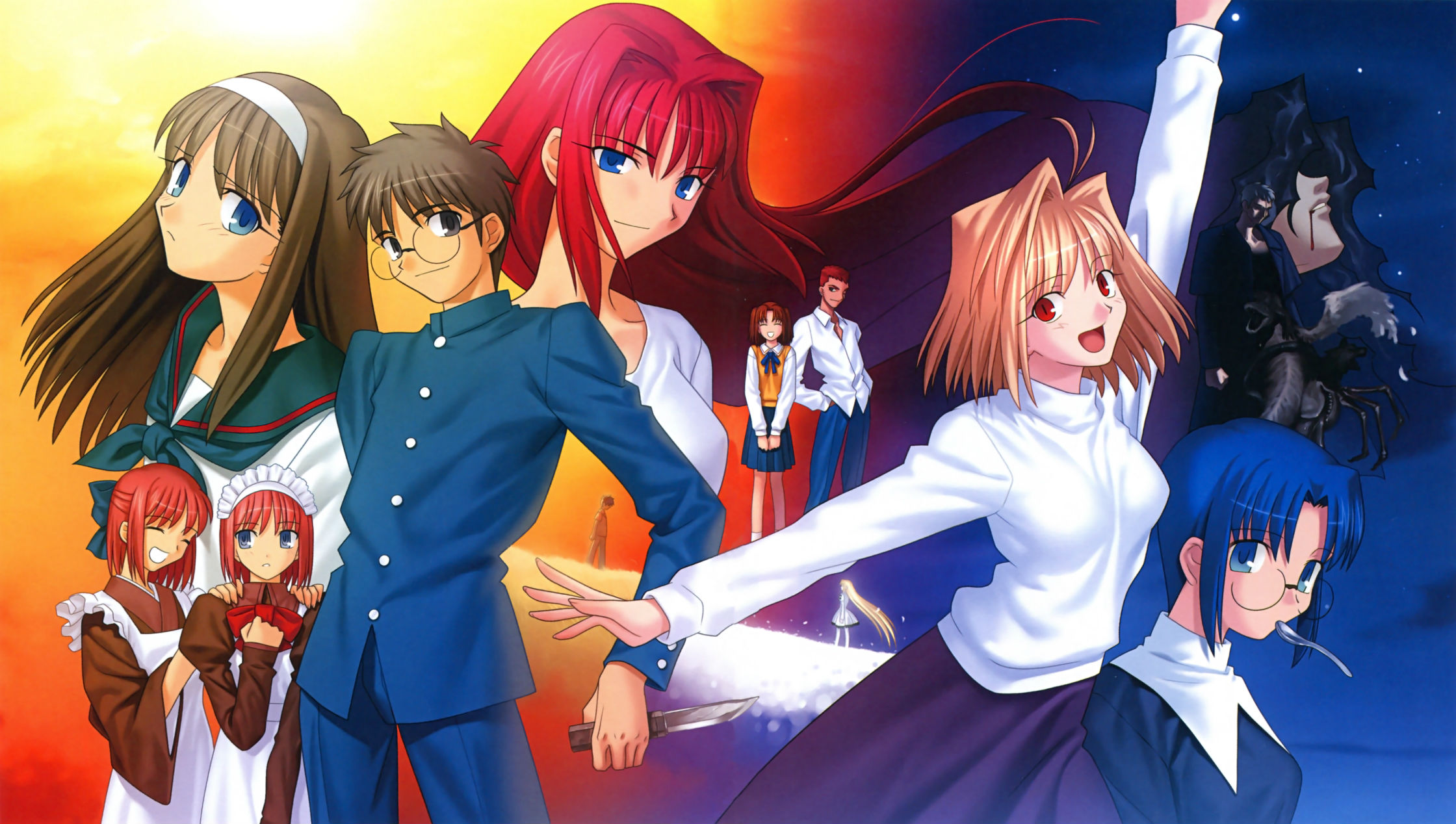 Description: A group of anime characters standing next to each other in front of a sunset background with a person holding a gun.