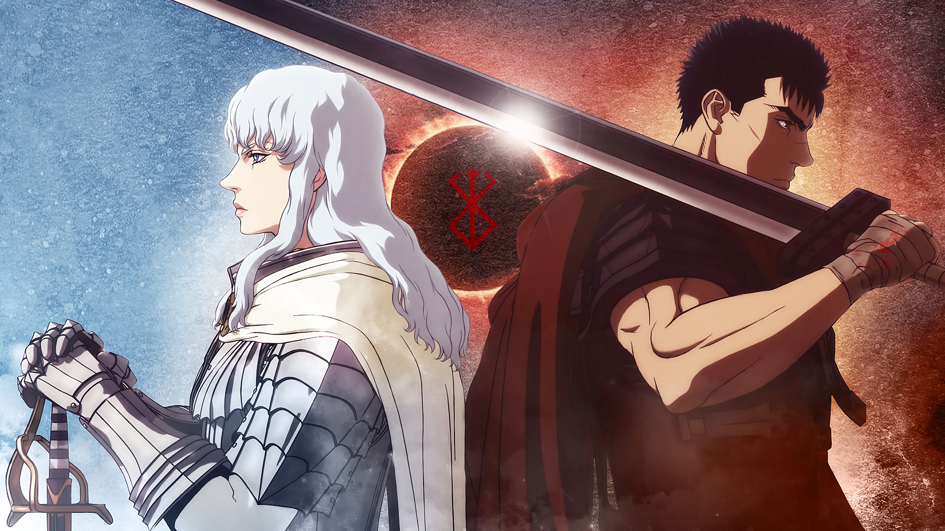 Description: A couple of anime characters holding swords in their hands and looking at each other with blood on them and a red background.