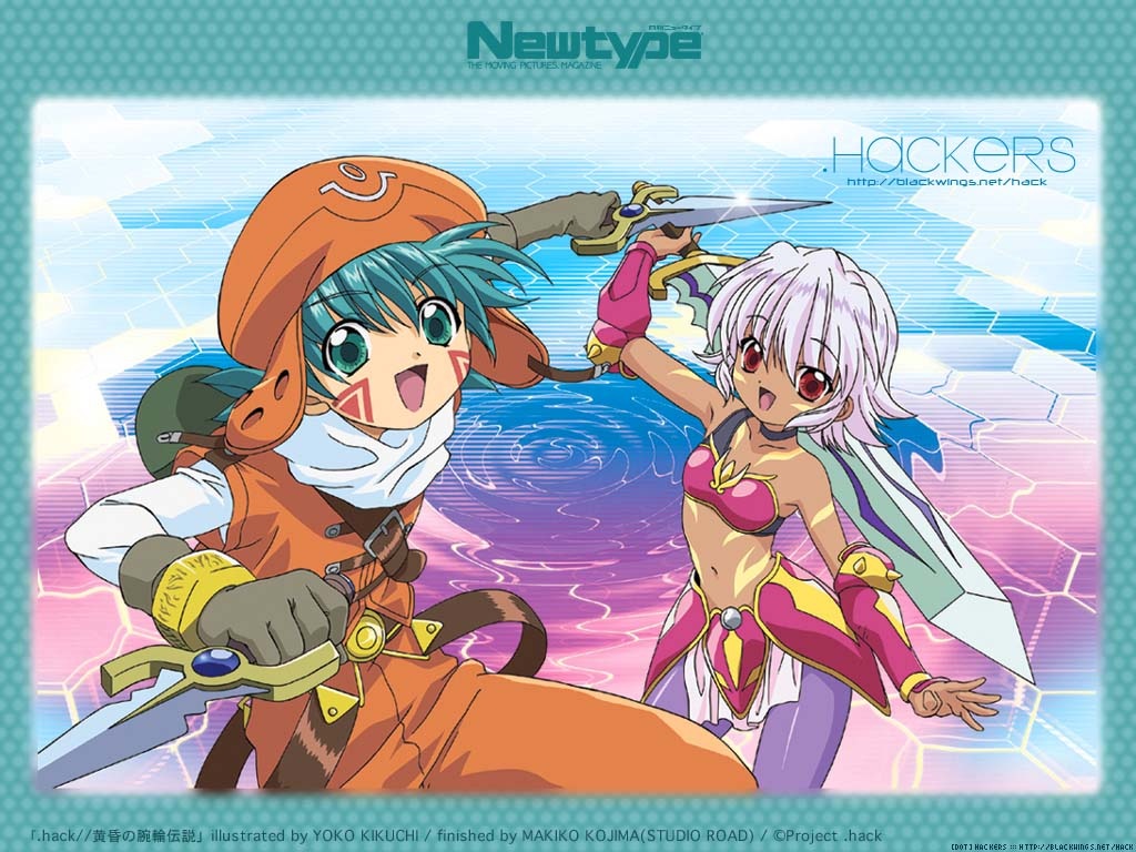 Description: Two anime characters with swords in their hands and a background with a blue sky and clouds in the background.
