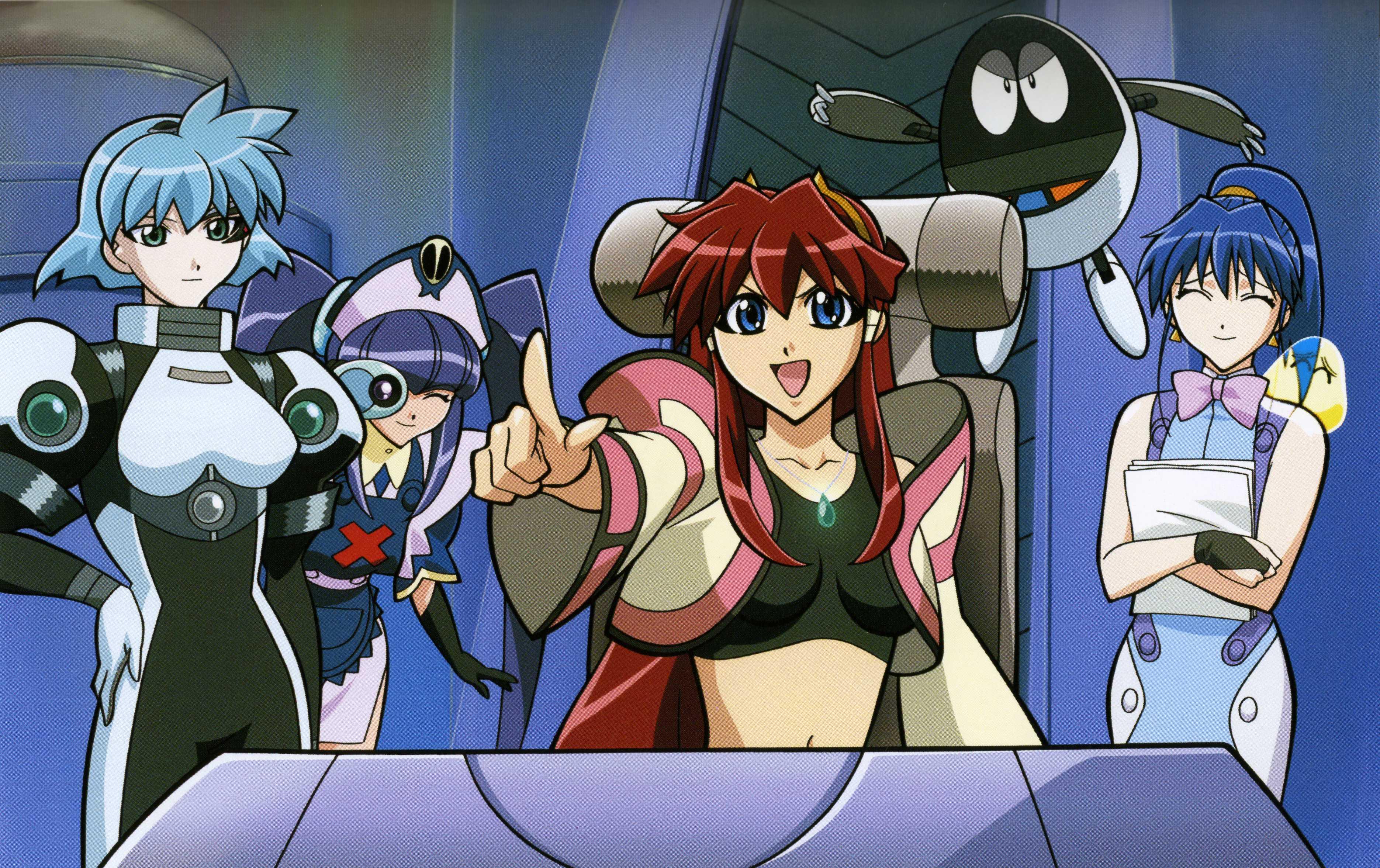Description: A group of anime characters standing around a table with a laptop on it and a woman pointing at the screen.