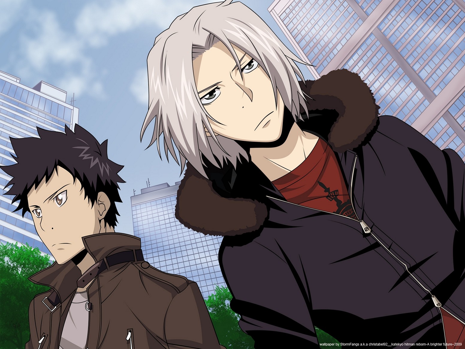 Description: Two anime characters standing in front of a tall building with a sky background and a city in the background.