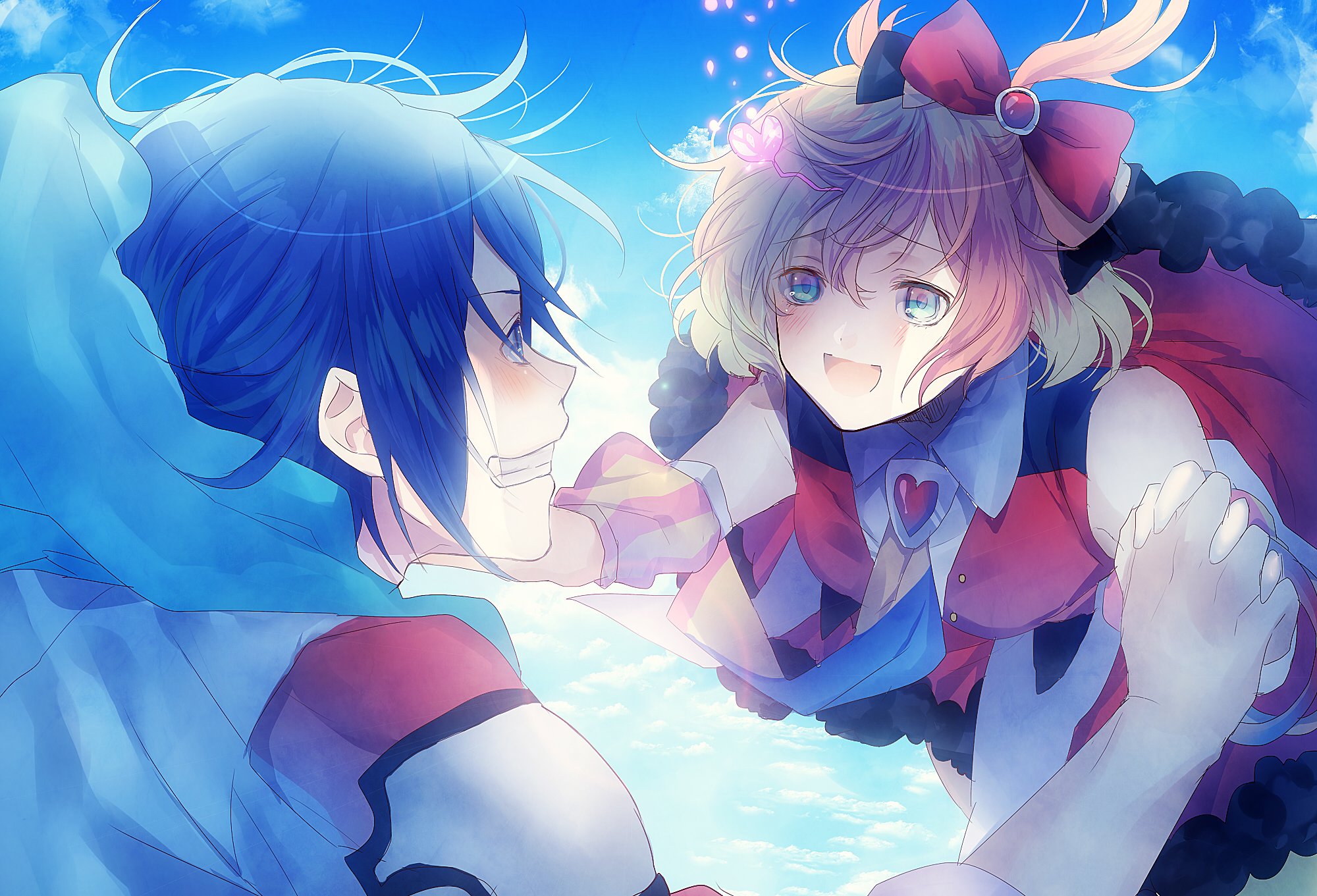 Description: Two anime characters are touching each other with their hands and looking at each other's eyes.