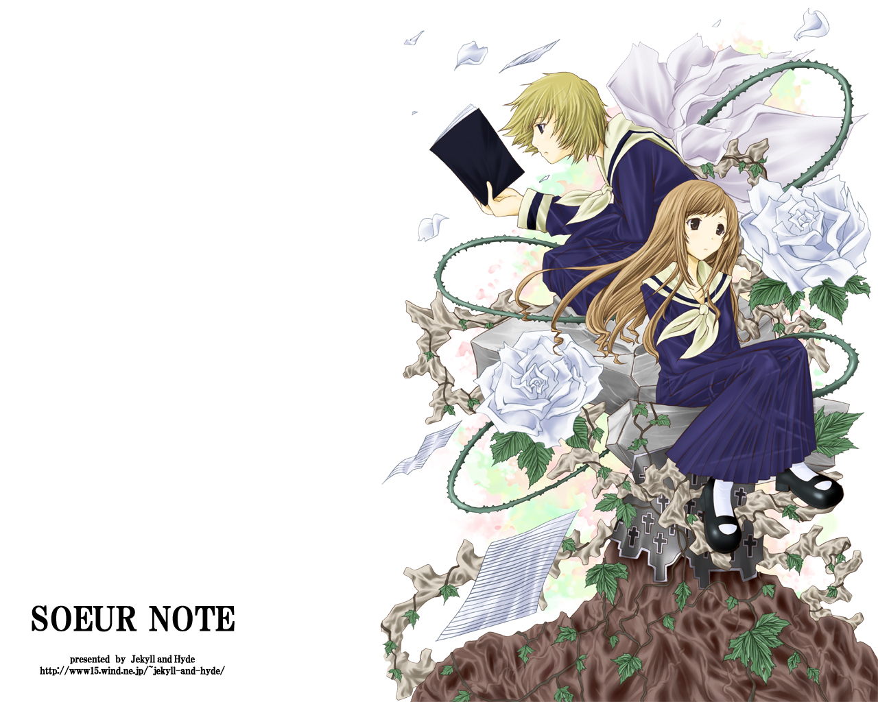 Description: A couple of anime characters sitting on top of a tree branch with flowers around them and a book in their hands.