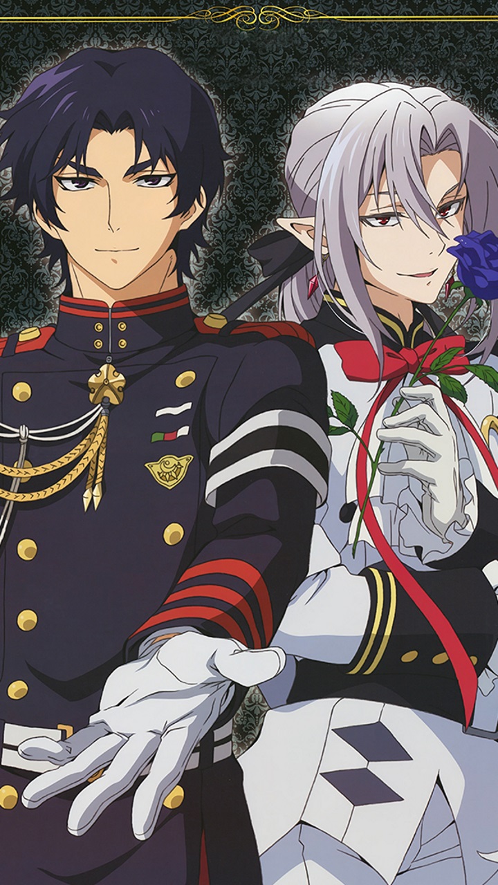 Description: Two anime characters are standing together in uniform and one is holding a flower in his hand and the other is wearing a white glove.