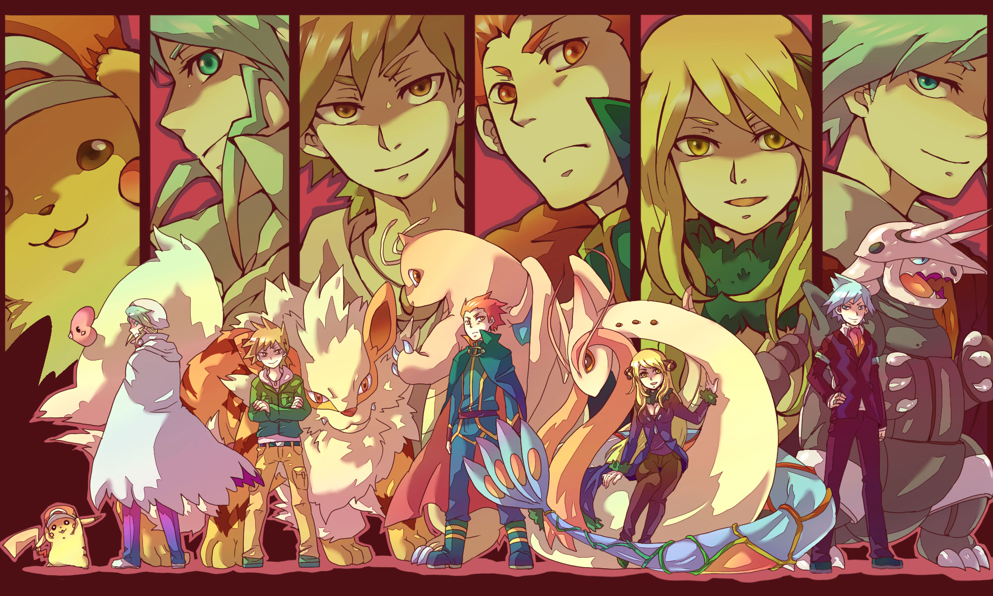 Description: A group of anime characters standing next to each other in front of a wall of pictures of them with different faces.