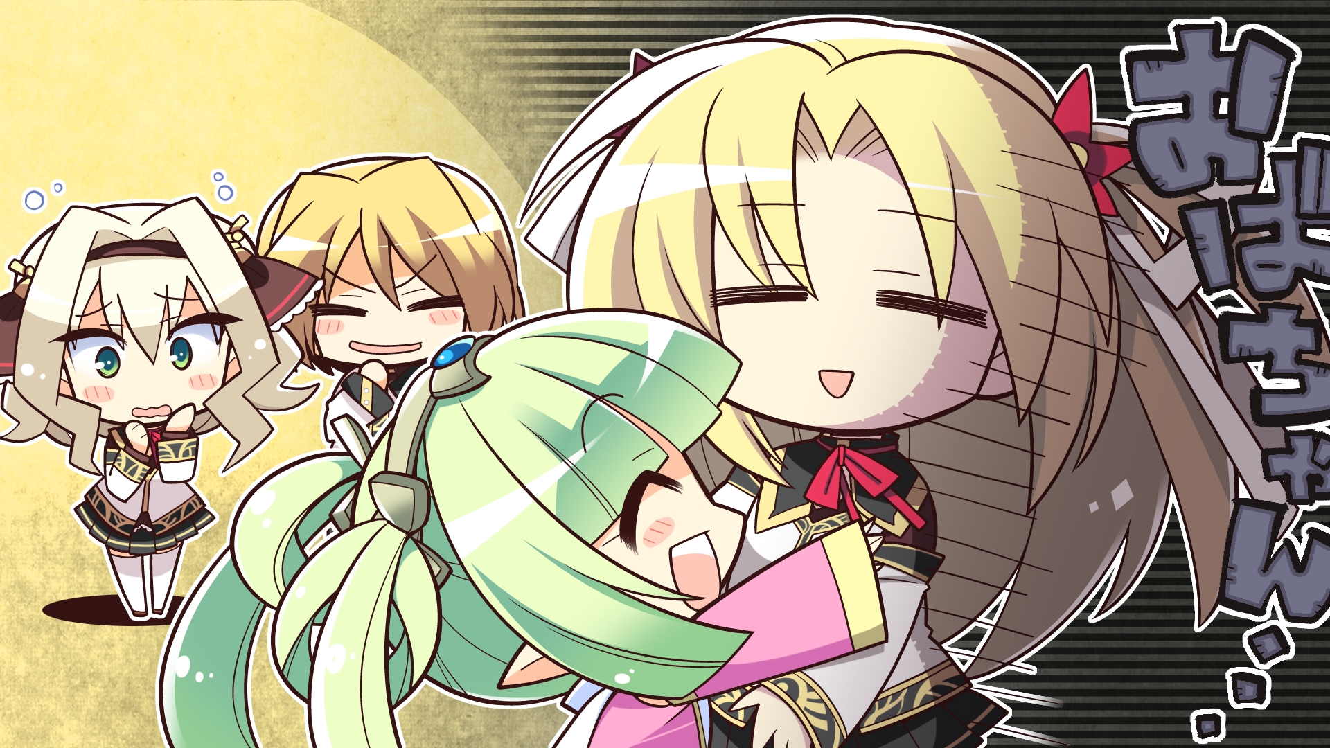 Description: A group of anime characters standing next to each other on a wallpaper background with japanese characters in the background.