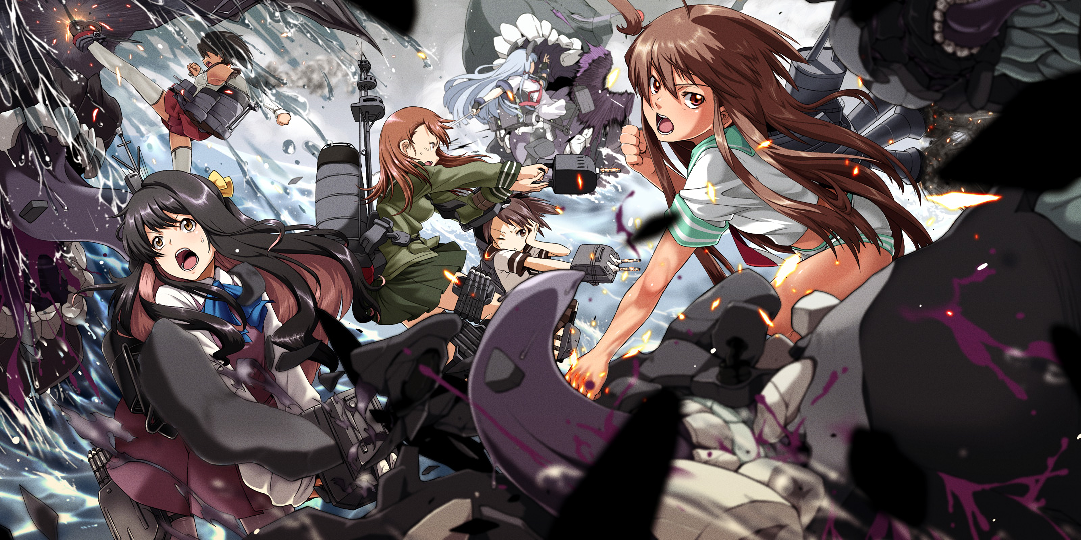 Description: A group of anime characters in a scene with a waterfall of water and rocks in the background.