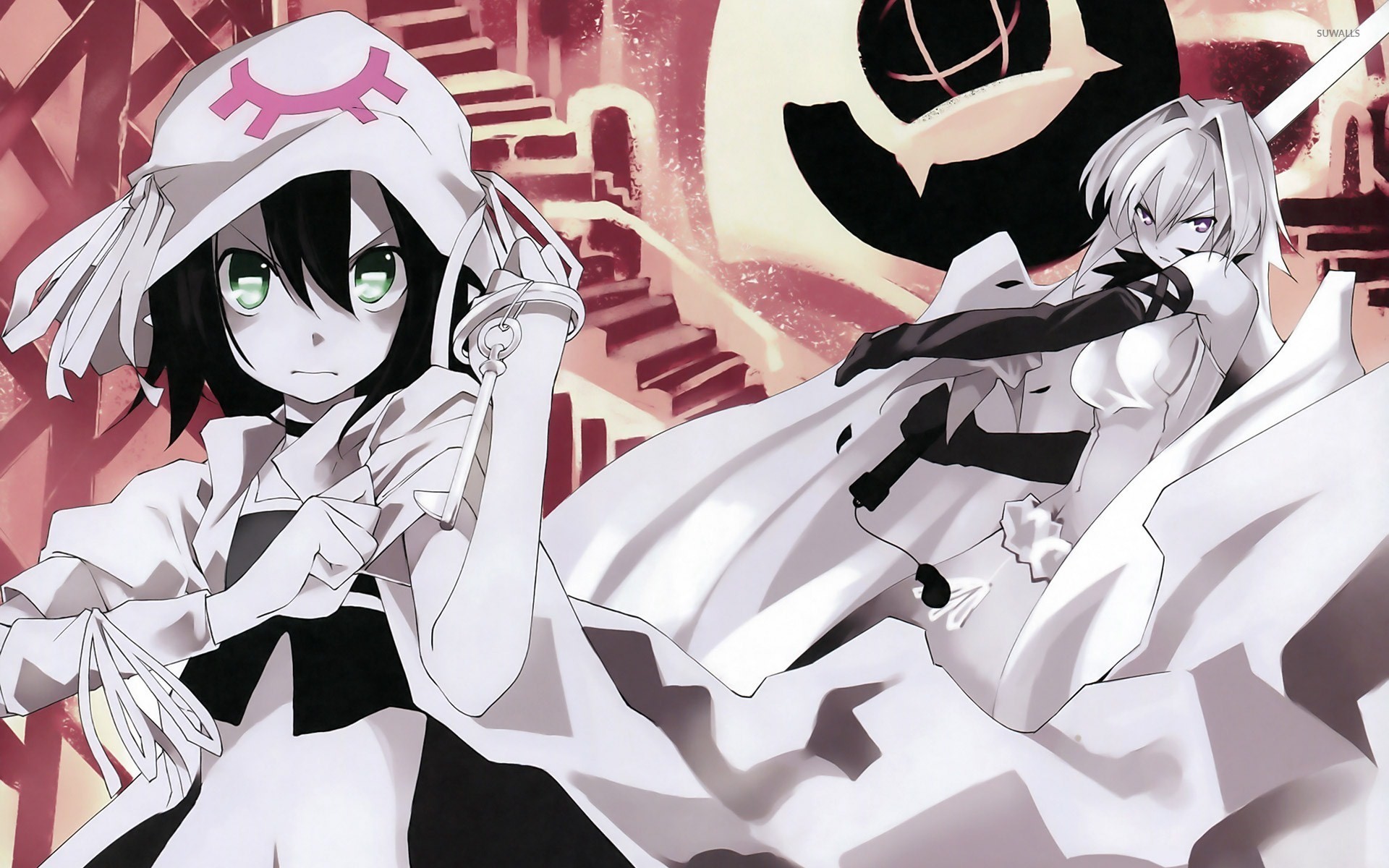 Description: Two anime characters in white outfits with black hair and green eyes.